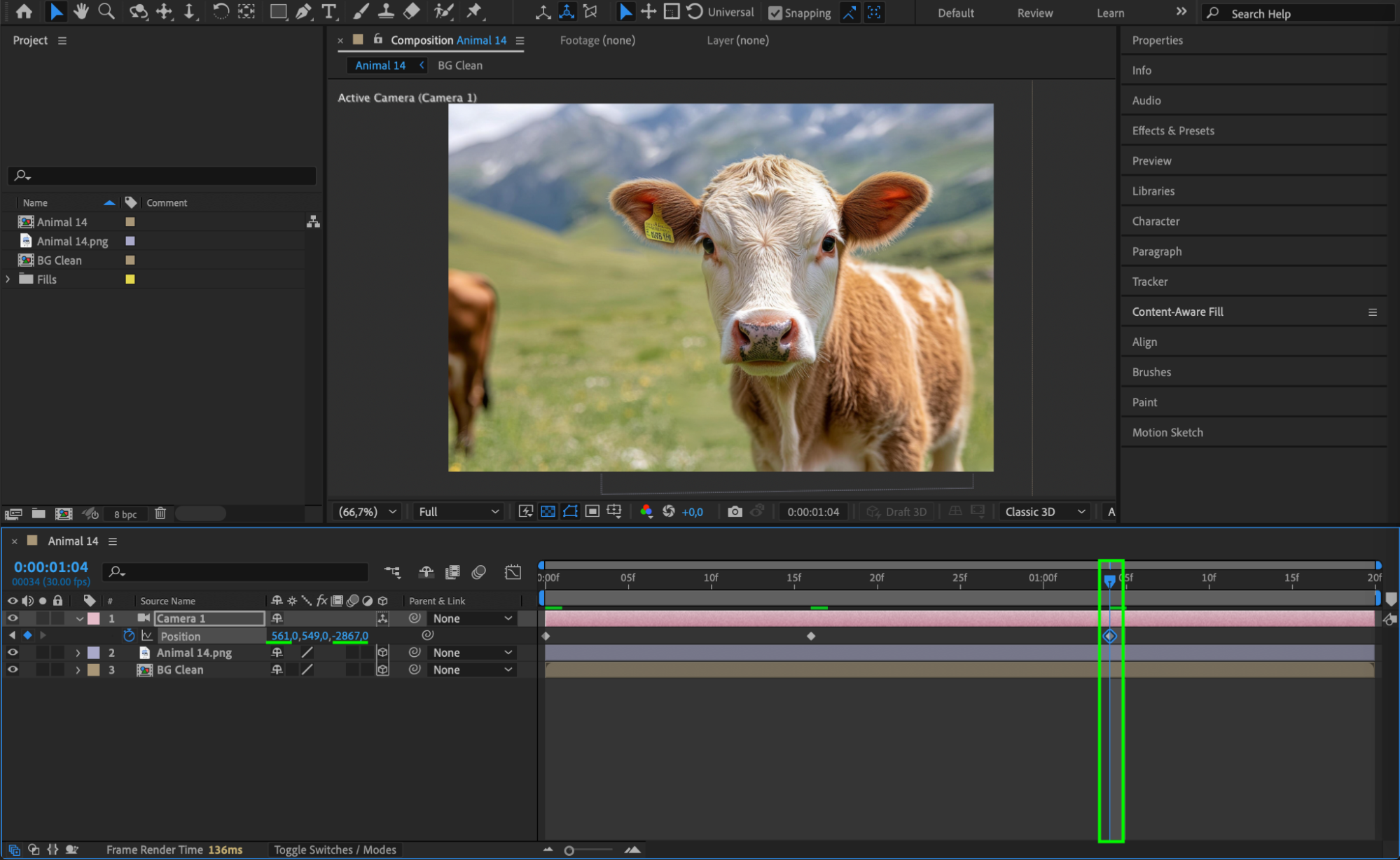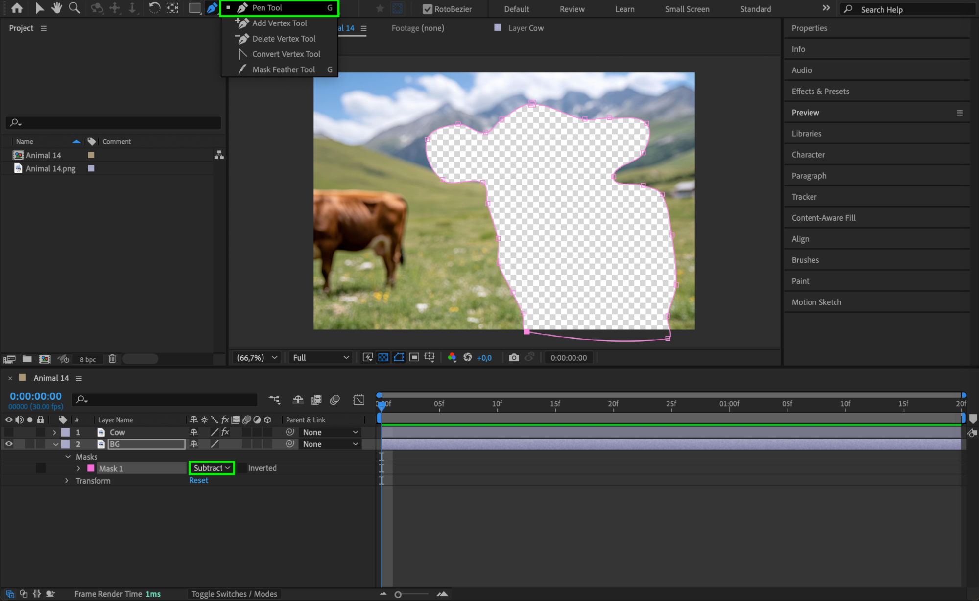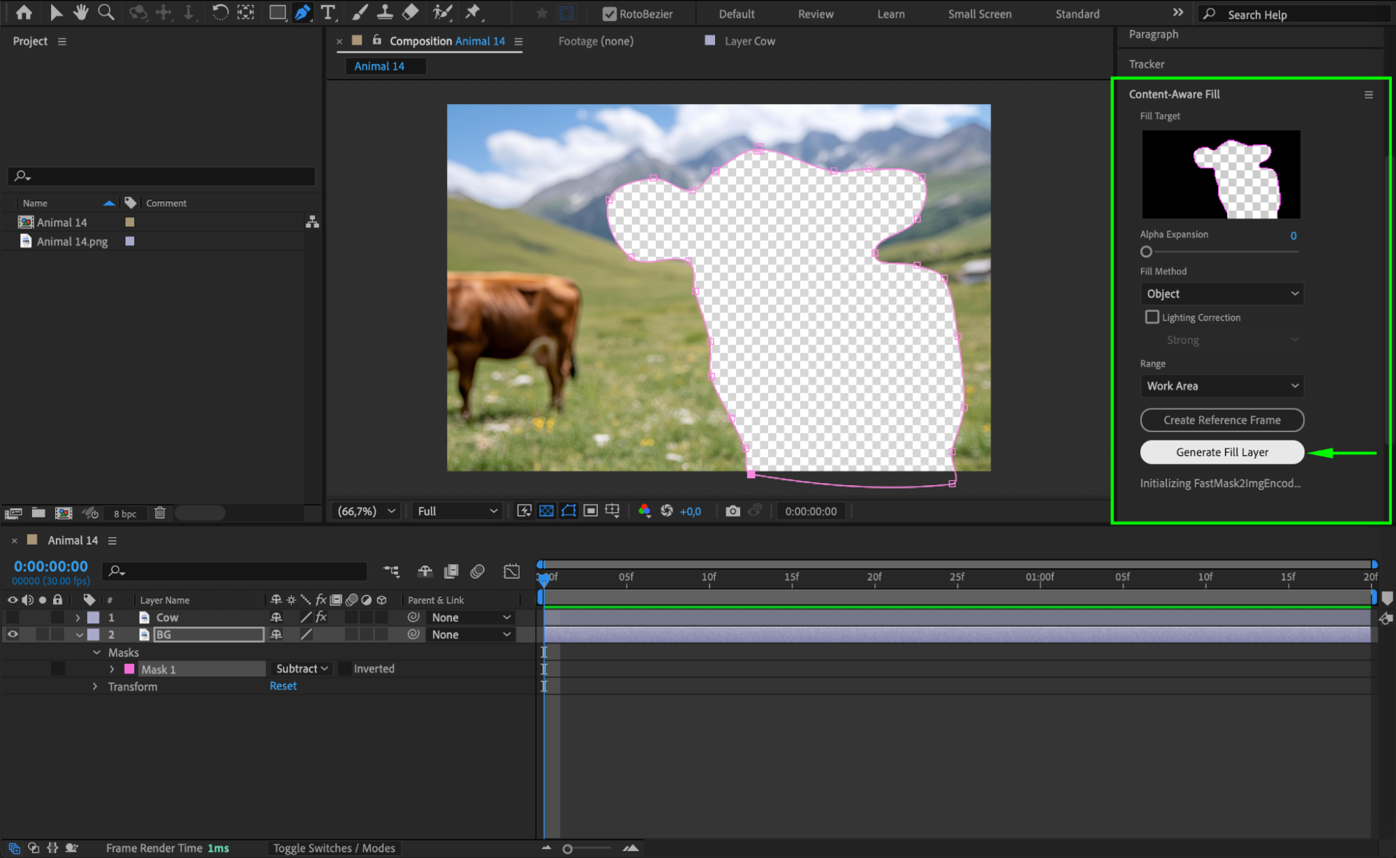 Go back to the Composition Panel and select the BG layer. Use the Pen Tool (G) to create a mask around the area where the subject was, then set the mask mode to Subtract to cut out the subject. Next, go to Window > Content-Aware Fill, choose the Object fill method, and click Generate Fill Layer to create a clean background.