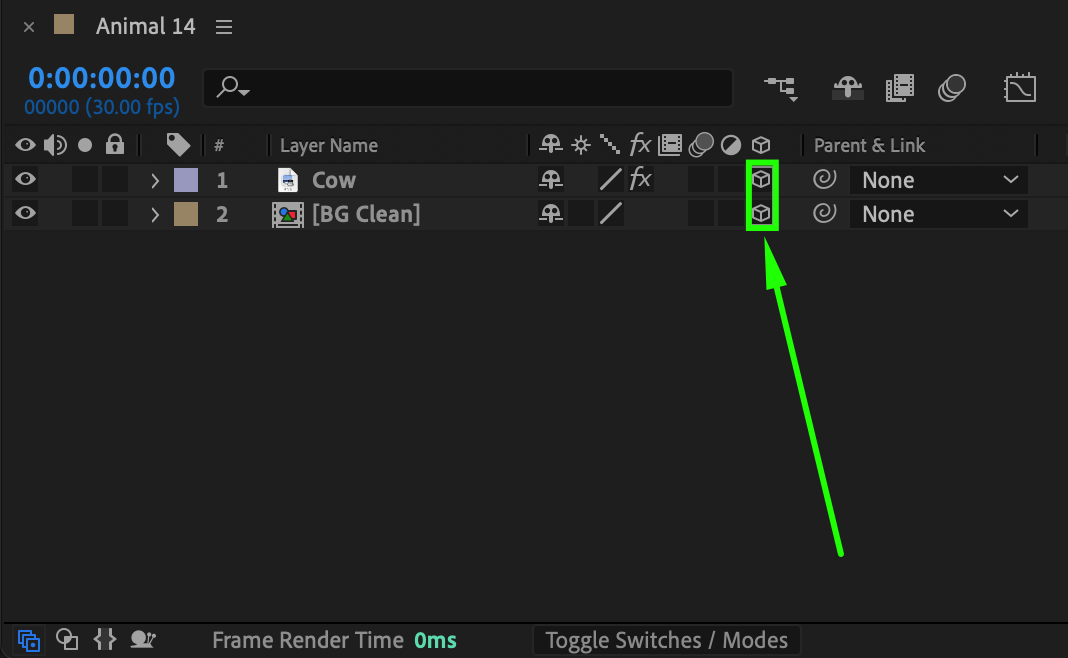 Select both the Subject and BG layers, then enable the 3D Layer option in the timeline. This allows you to add depth and move the camera around them for a 3D effect.
