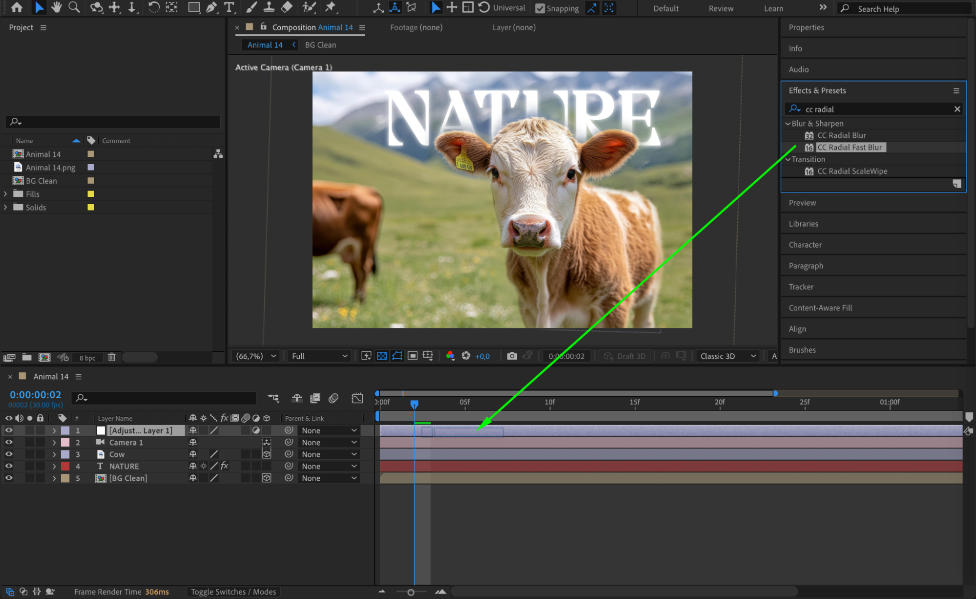 Go to Layer > New > Adjustment Layer and apply the CC Radial Fast Blur effect from the Effects & Presets panel. This will enhance motion and depth perception.