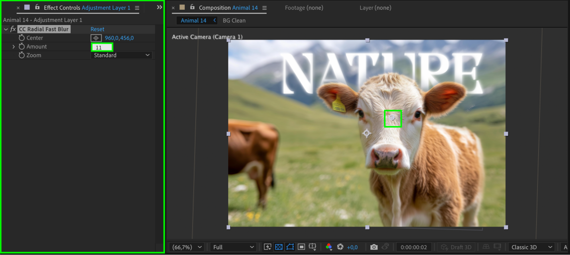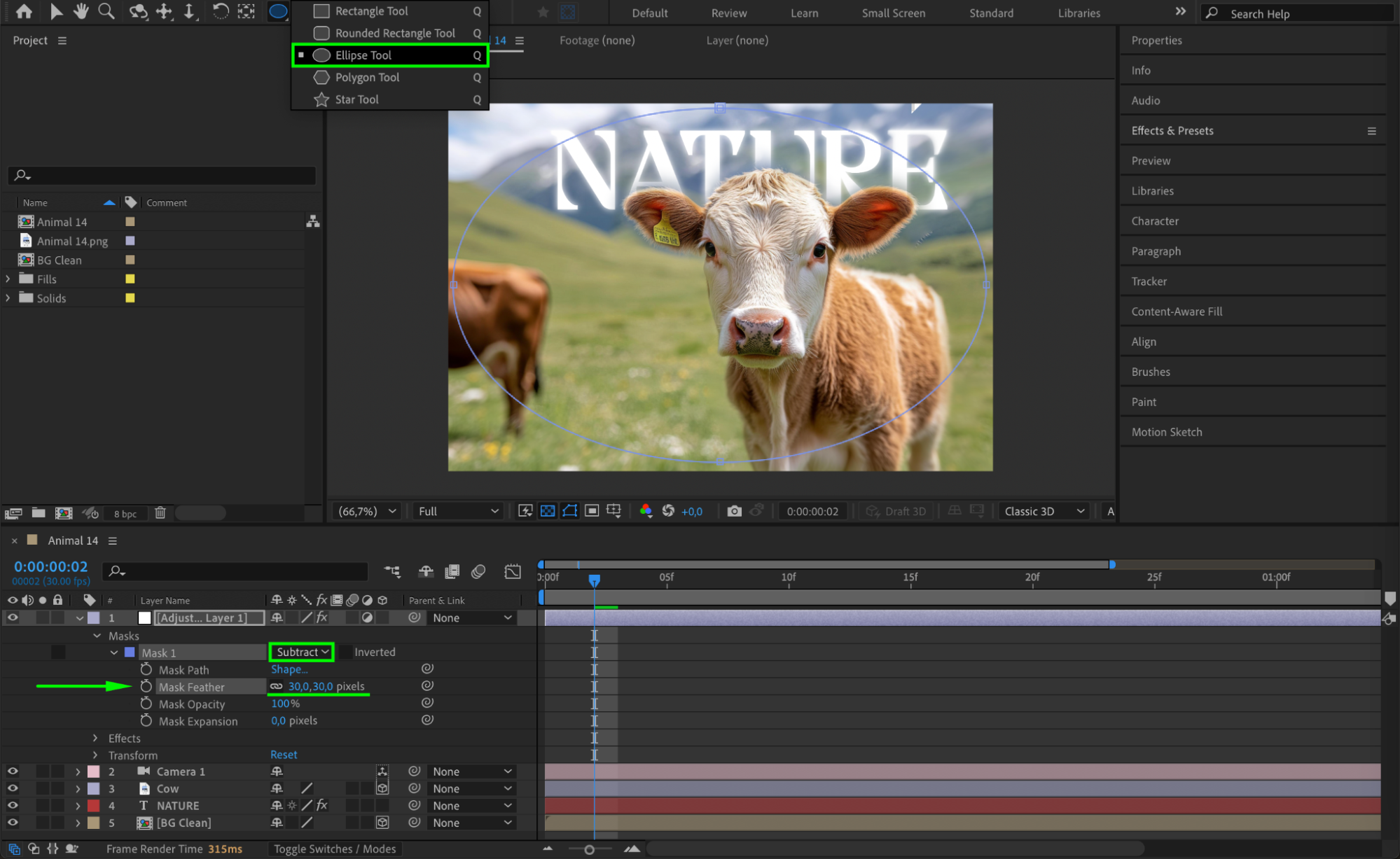 Select the Adjustment Layer, then use the Ellipse Tool (Q) to draw a mask in the center of the composition. Set Mask Feather to 30 for a smooth transition between sharp and blurred areas.