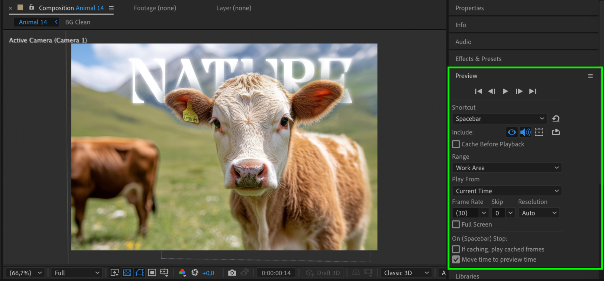 Press Spacebar to preview the animation. Make any necessary adjustments to the camera movement, blur, or depth to achieve a polished 3D effect.