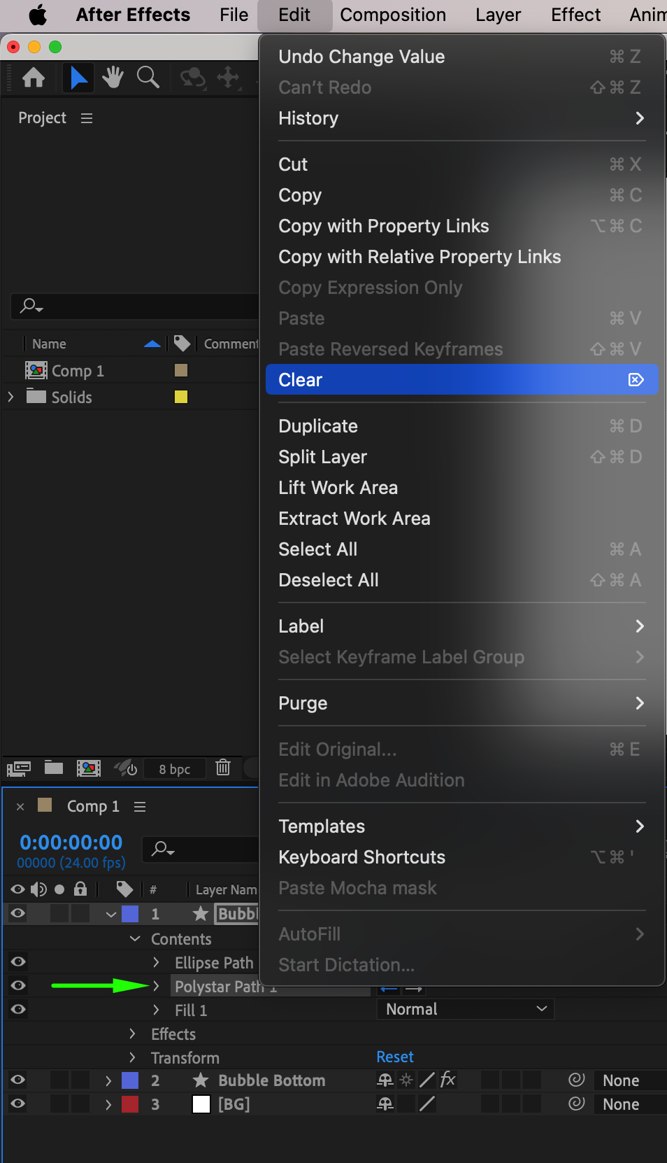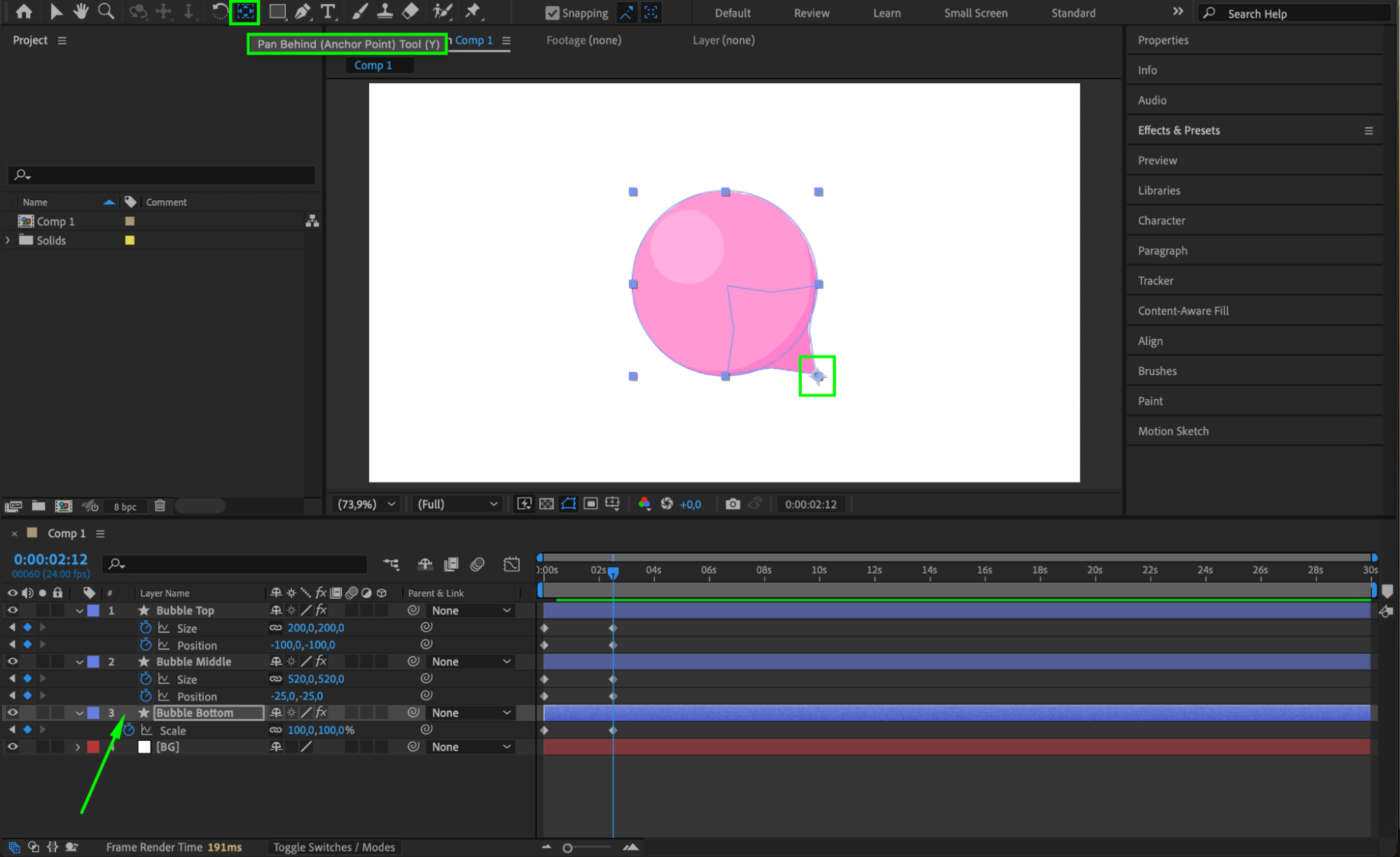 Select Bubble Bottom and use the Pan Behind Tool (Y) to adjust its anchor point to the lower-right corner of the Polystar shape.