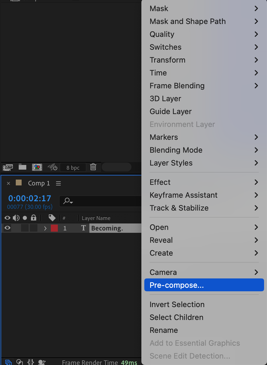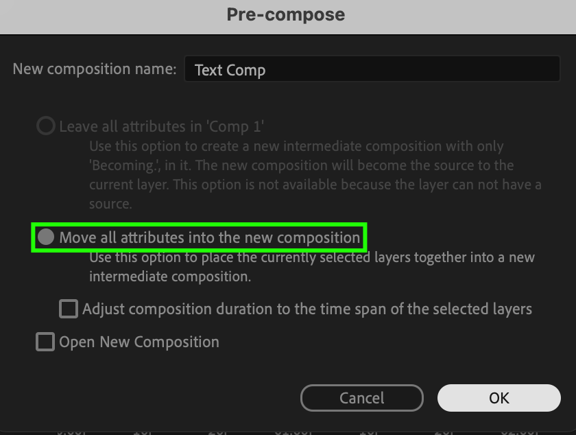 Right-click on the moving layer and select Pre-compose. In the pop-up window, choose Move all attributes into the new composition and click OK. This places the animated layer inside a separate composition, allowing you to mask it independently.