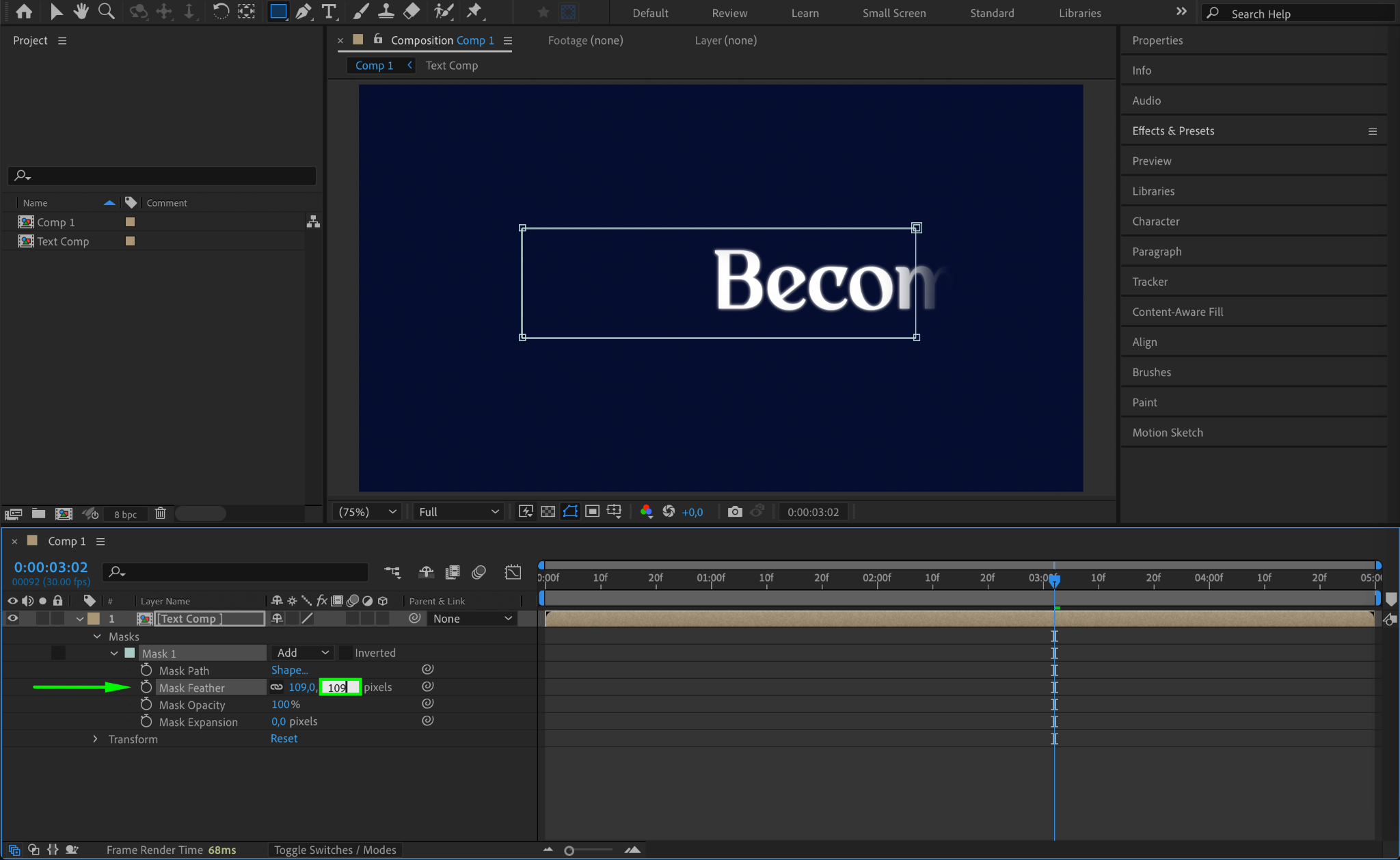 Select the newly created pre-composed layer, then choose the Shape Tool (Q). Draw a mask on the layer as needed. Adjust Mask Feather to around 109 for a smooth transition, if required. Since the animation is inside the pre-comp, the mask will now stay in place.