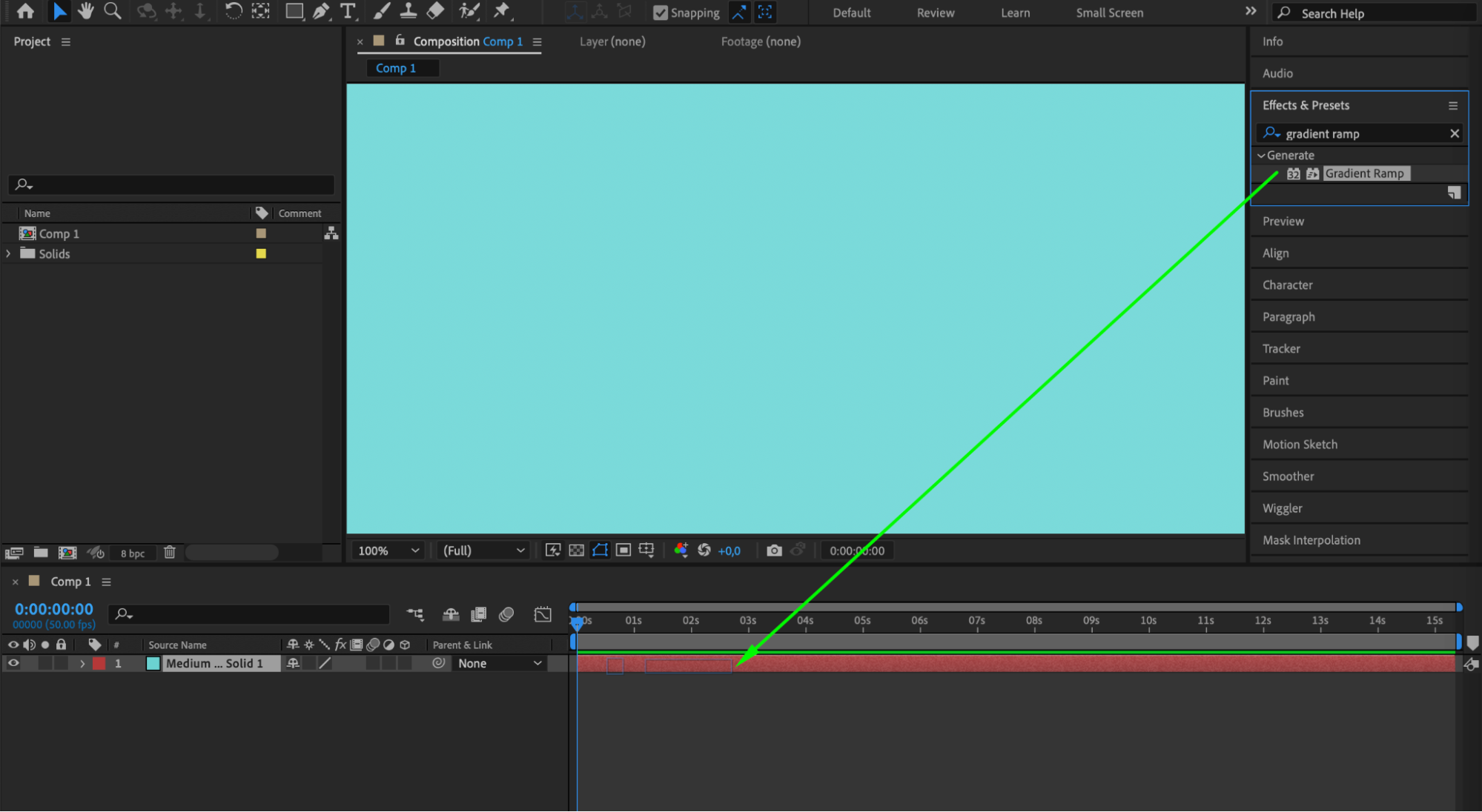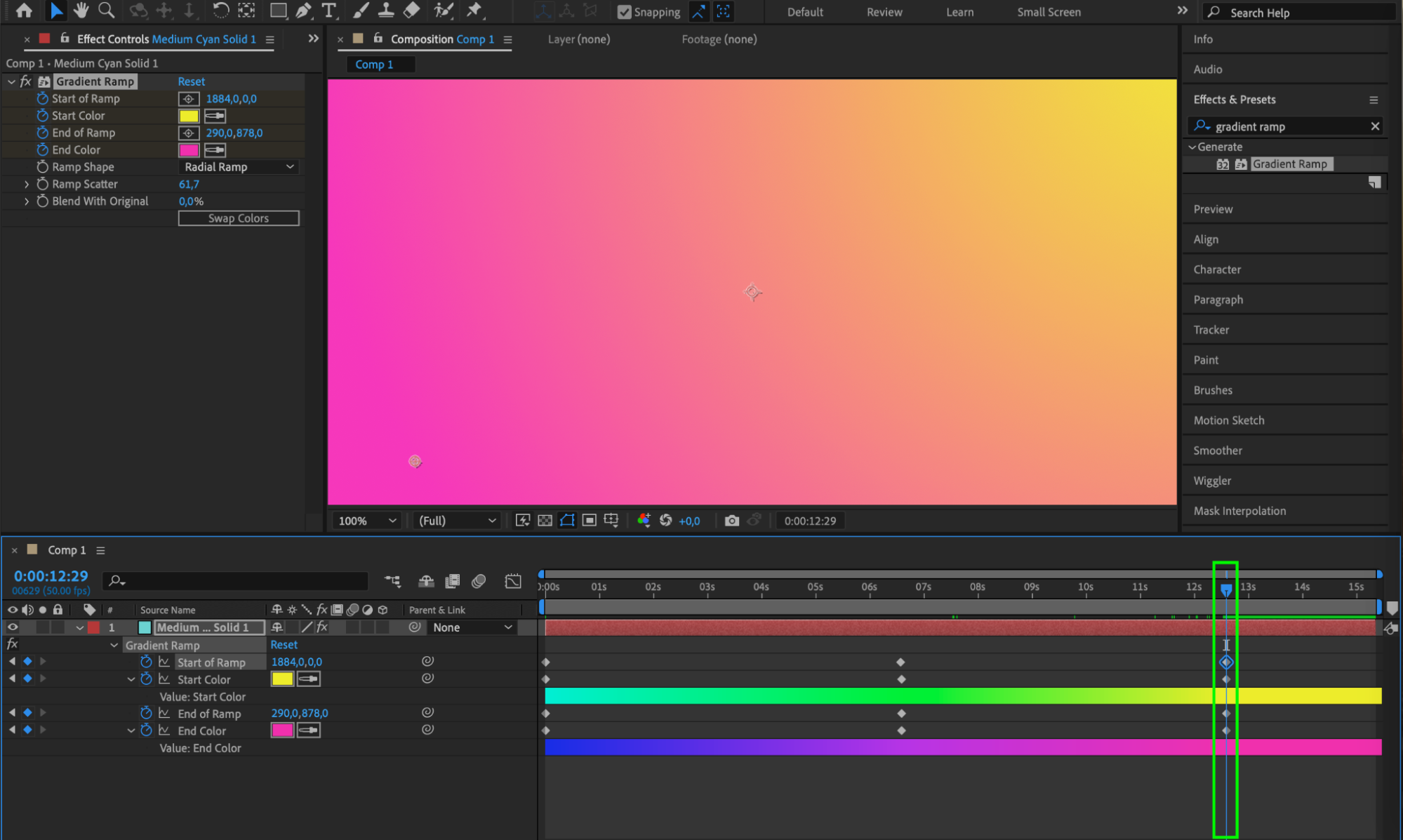 Navigate to the Effects & Presets panel and find the “Gradient Ramp” effect. Drag and drop it onto your solid layer. In the Effect Controls panel, you can adjust the colors and shape of the gradient to suit your design.
