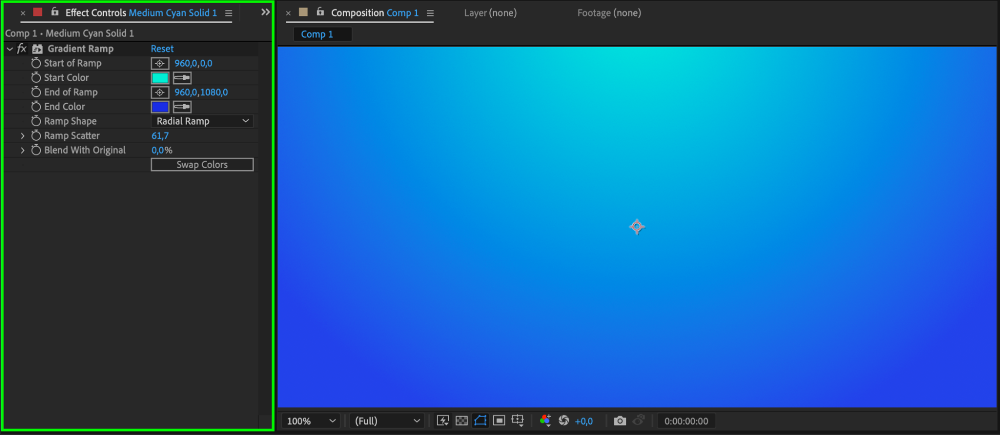 To animate the Gradient Ramp, click the stopwatch icon next to the Start and End of Ramp parameters in the Effect Controls panel. Press the “U” key to reveal the keyframes on the timeline and adjust them to create a dynamic gradient animation.