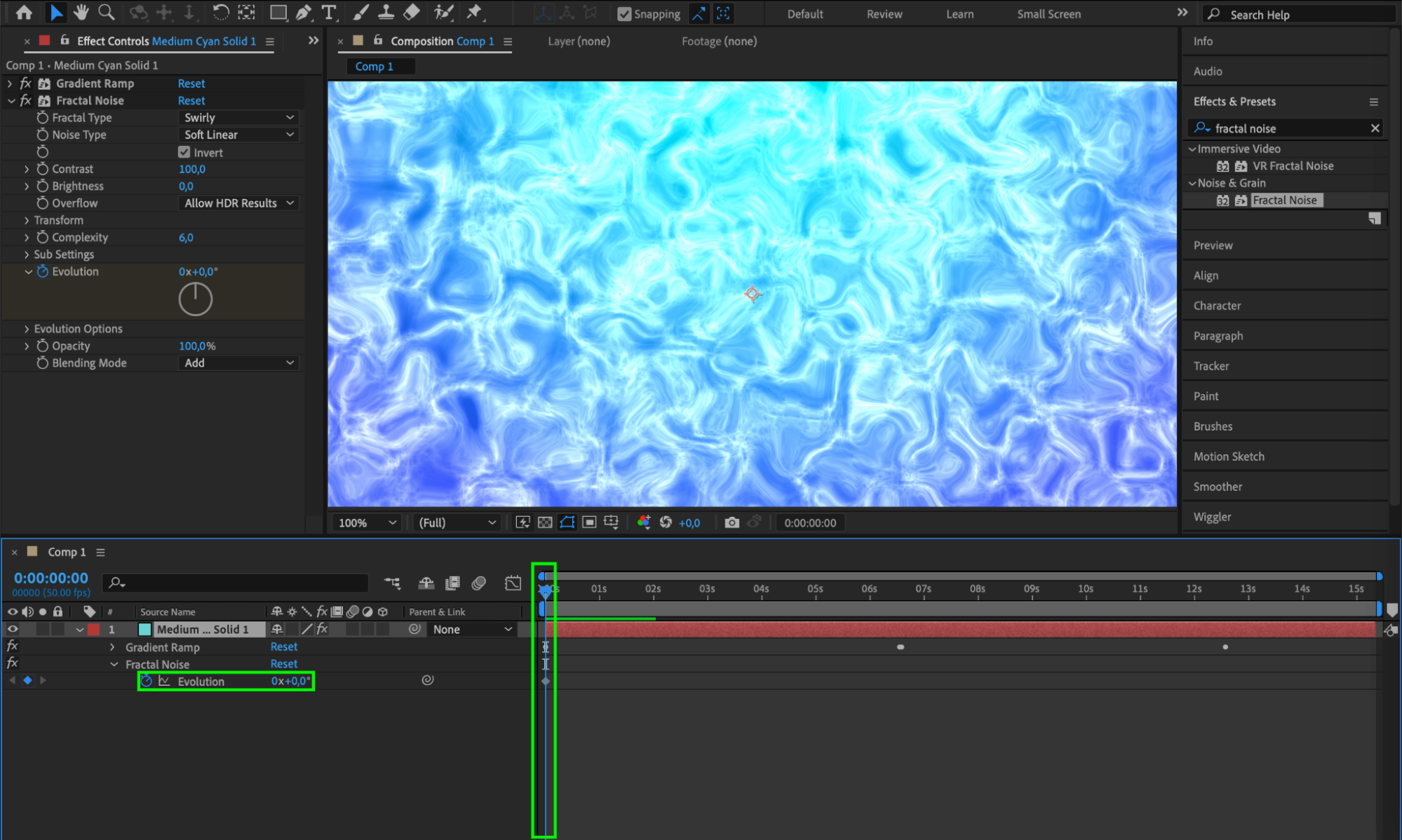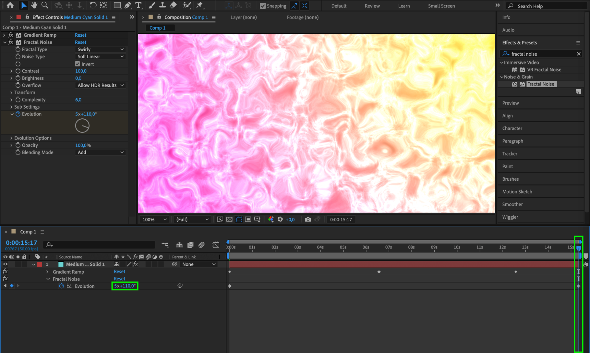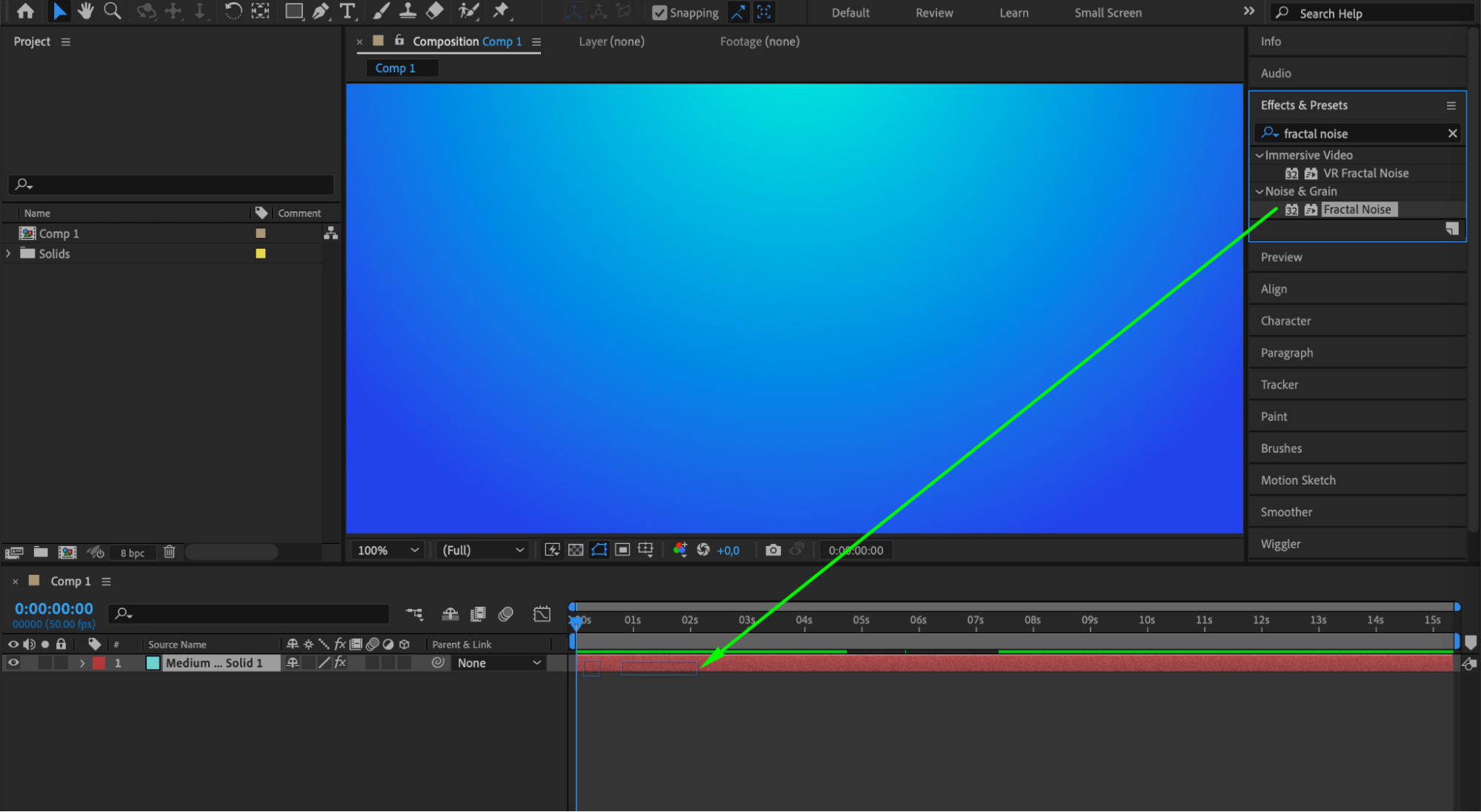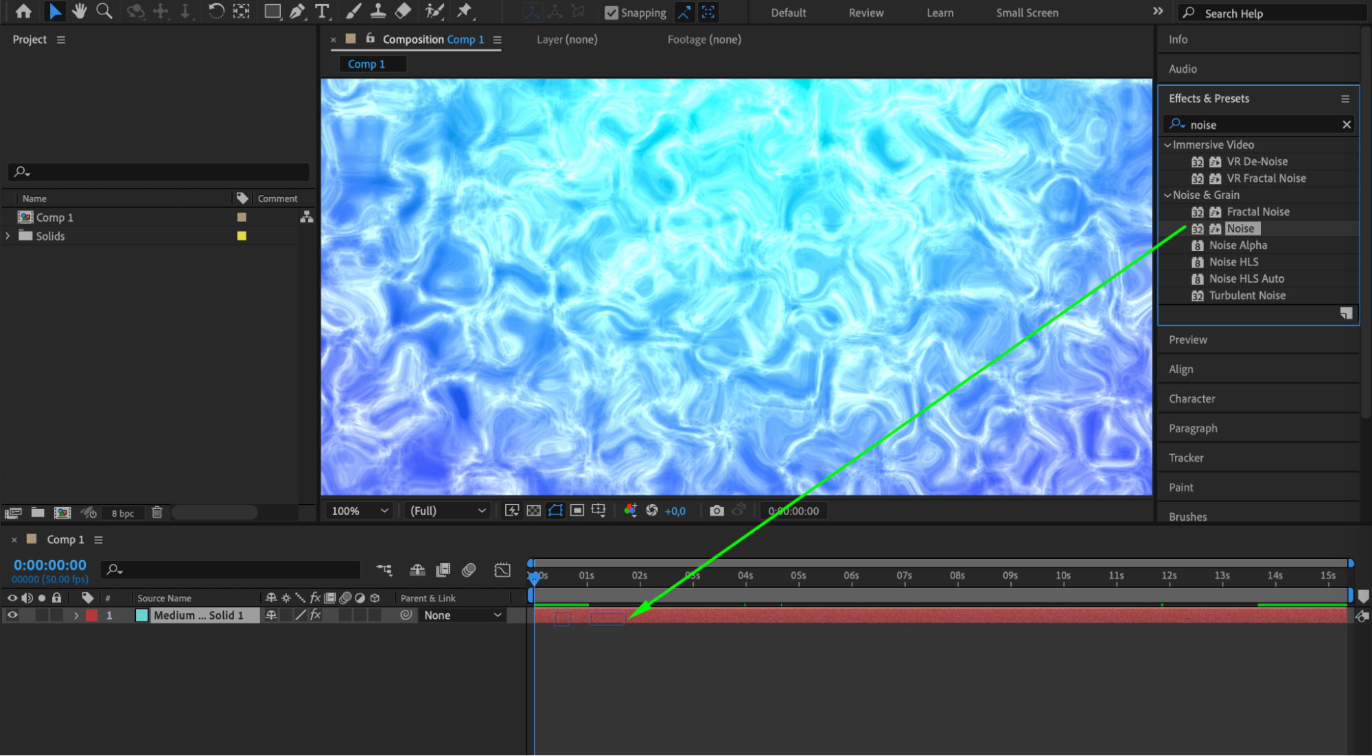 Apply the “Fractal Noise” effect to your solid layer by dragging it from the Effects & Presets panel. This effect has immense potential, allowing you to create intricate and mesmerizing patterns by tweaking its parameters in the Effect Controls panel.