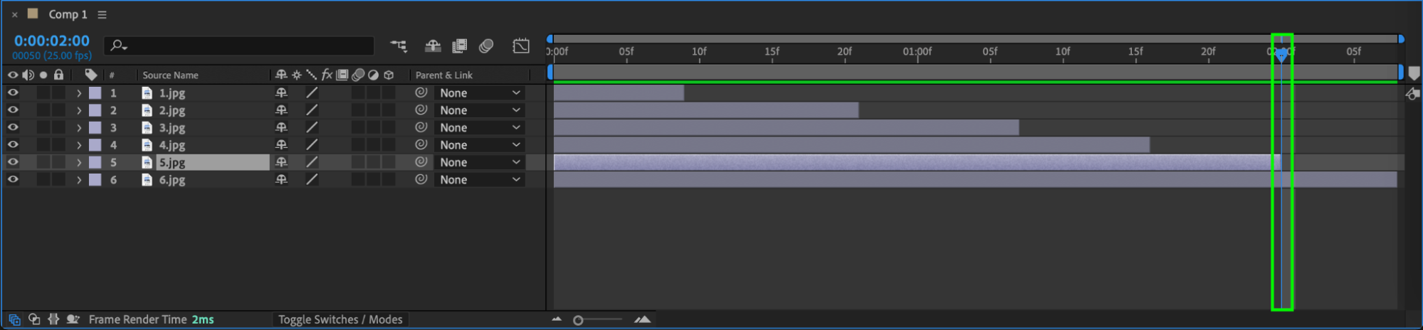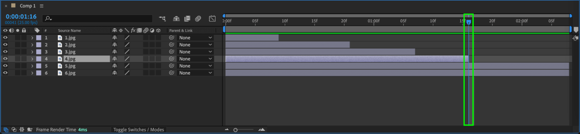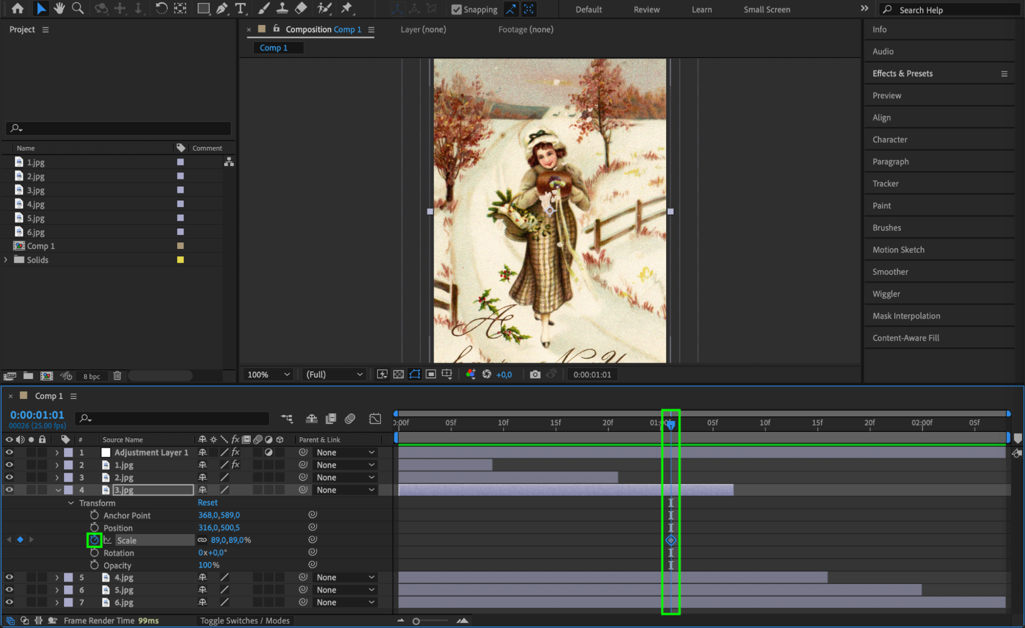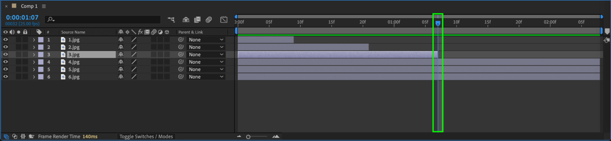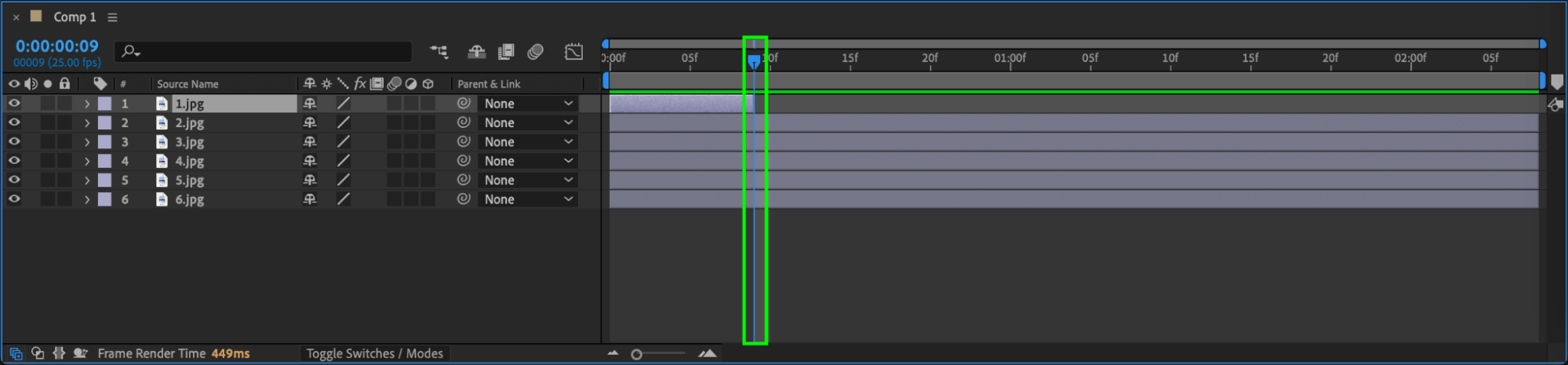 Use the “Alt/Option + [” and “Alt/Option + ]” shortcuts to trim your photo layers using the current time indicator. Arrange each photo layer within the composition panel as desired.