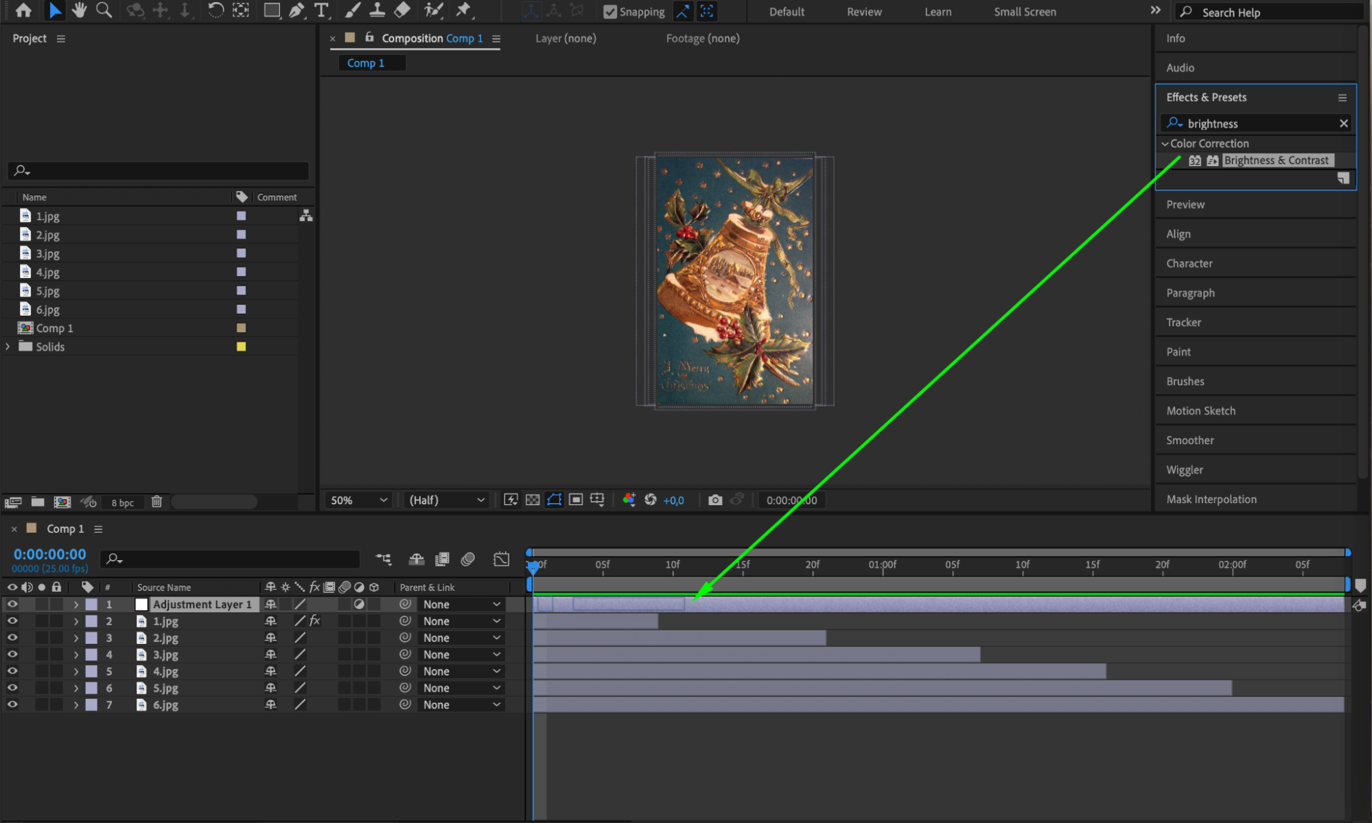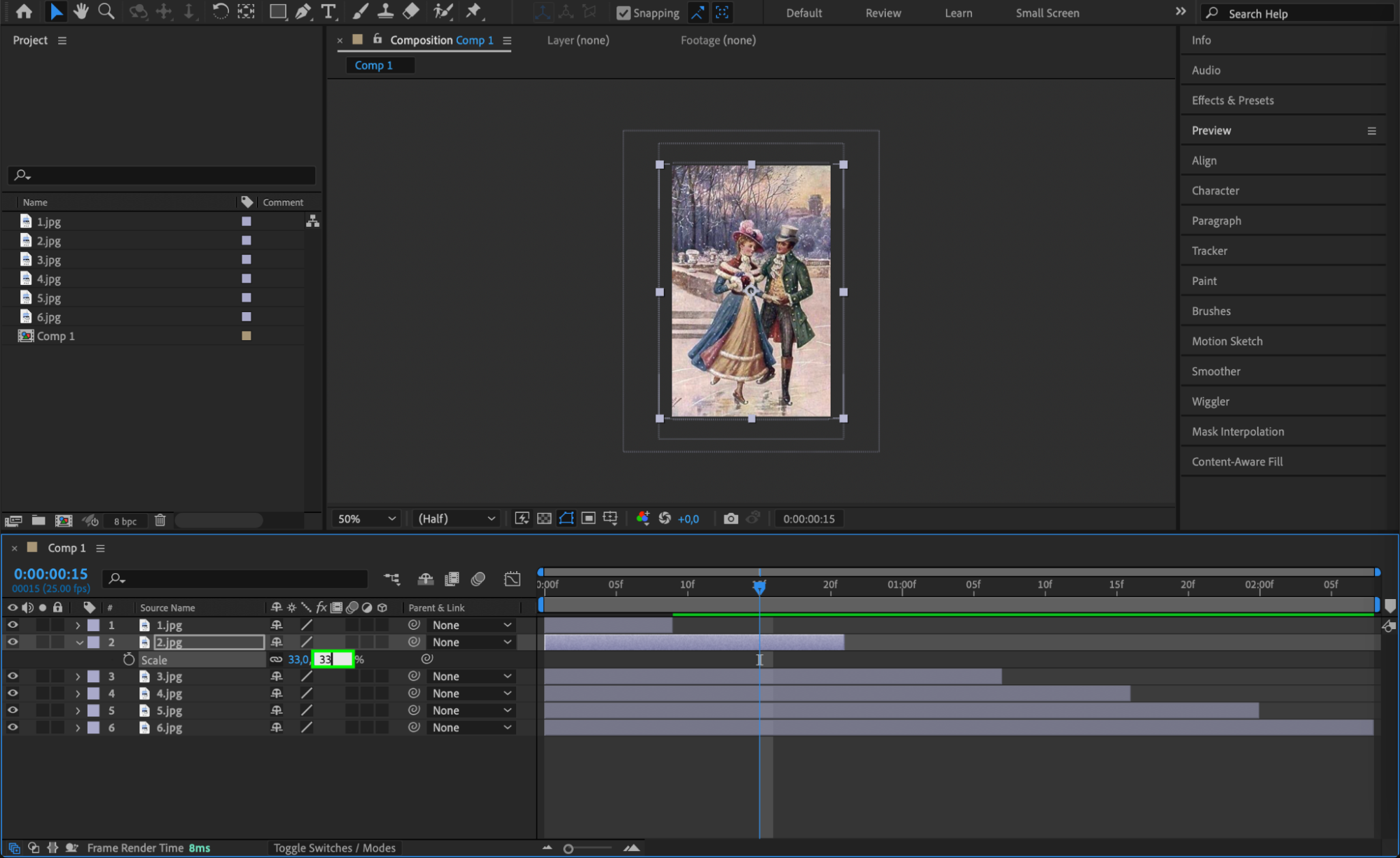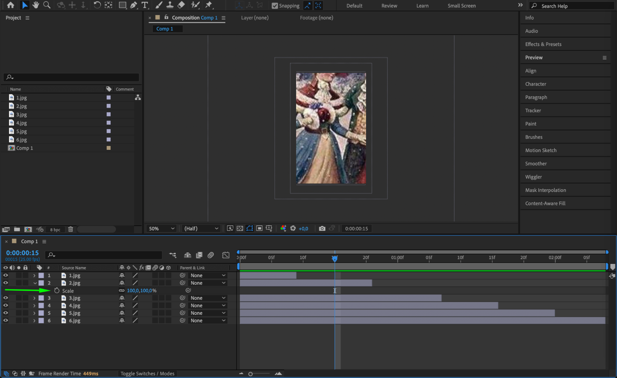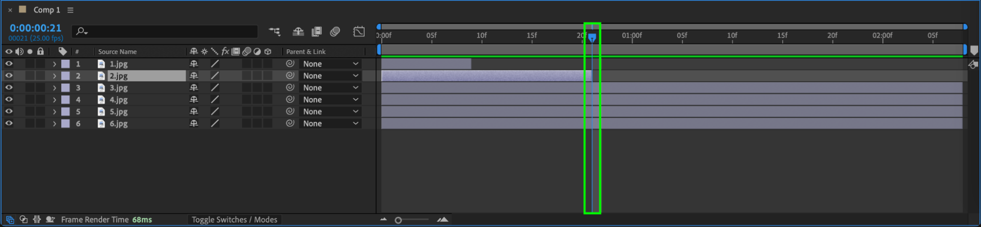 Use the “Alt/Option + [” and “Alt/Option + ]” shortcuts to trim your photo layers using the current time indicator. Arrange each photo layer within the composition panel as desired.