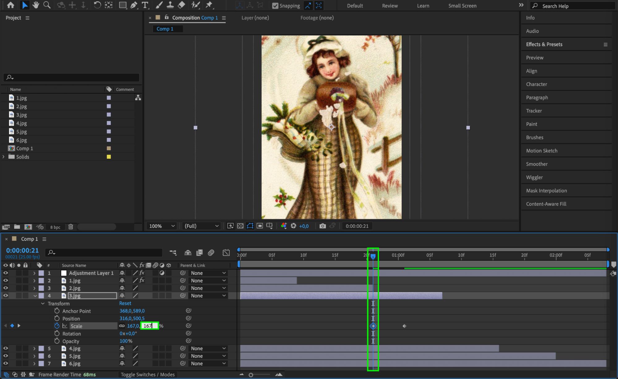 Animate individual photos using scaling, panning, rotations, and other techniques available in After Effects. Create dynamic movements across the composition to keep viewers engaged.