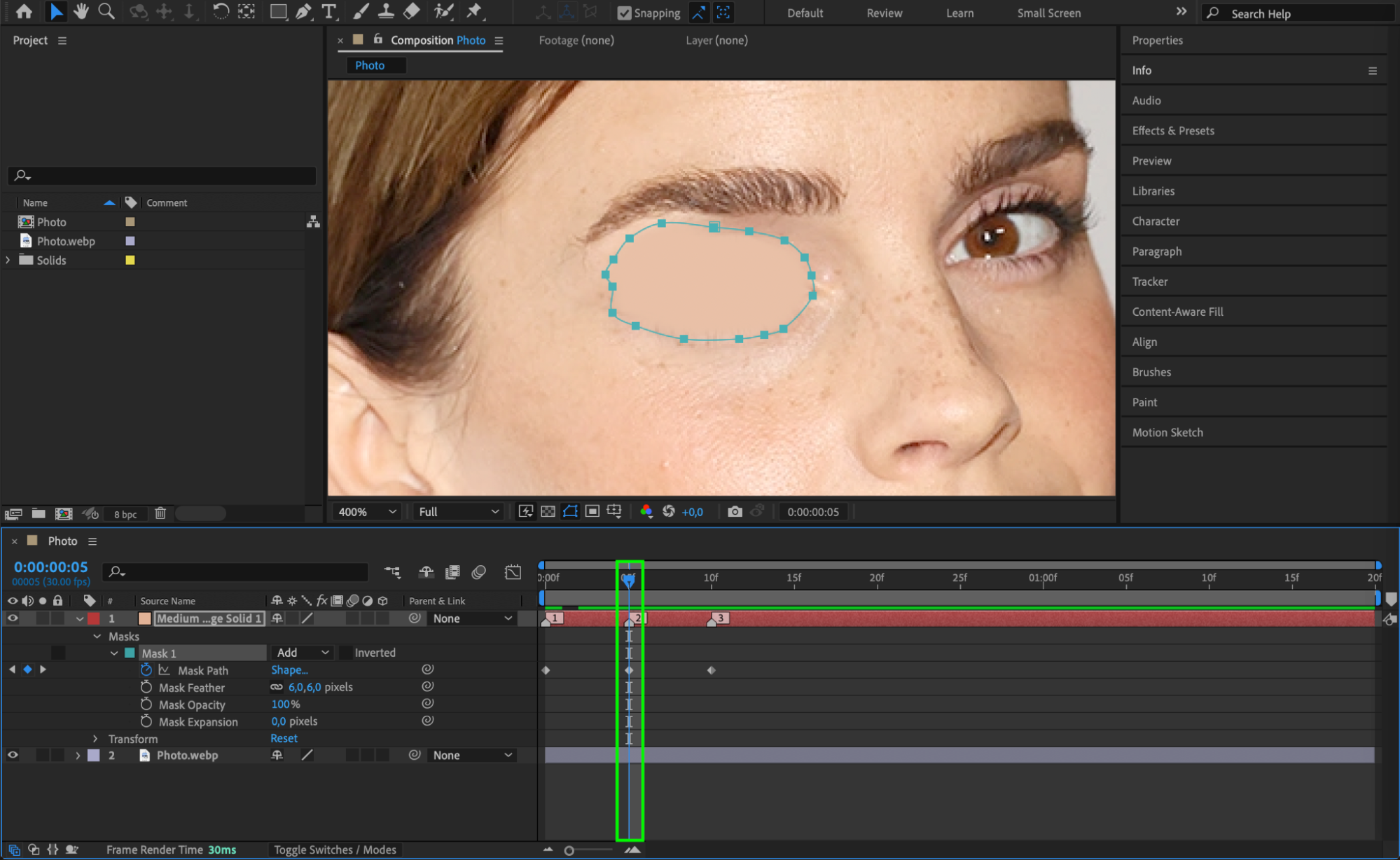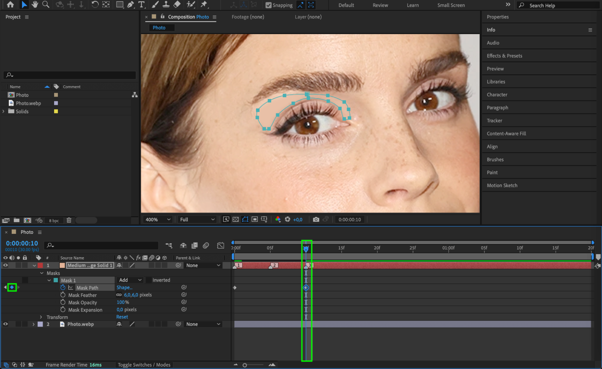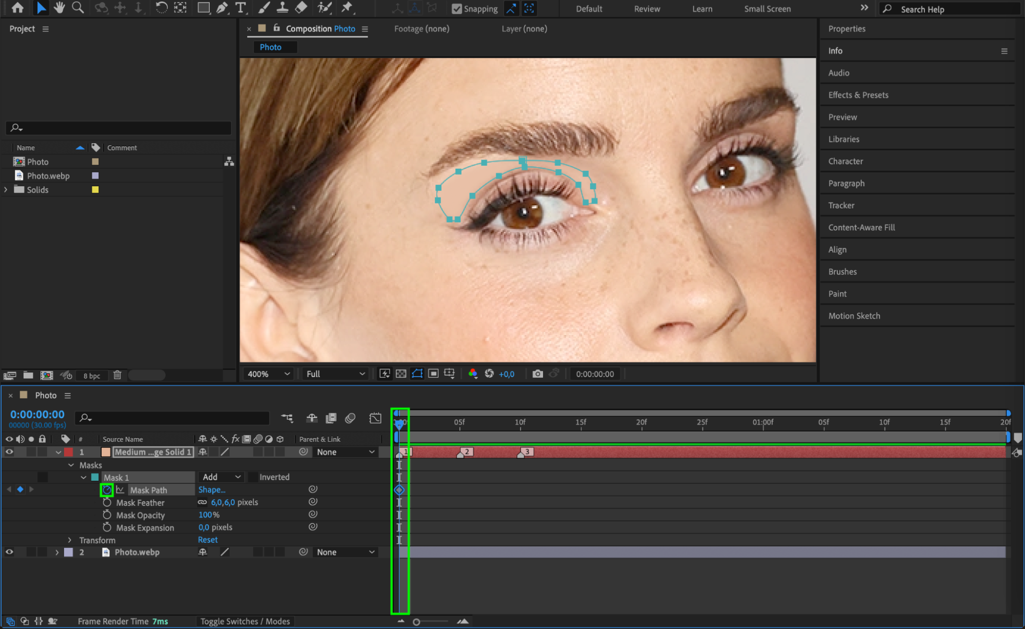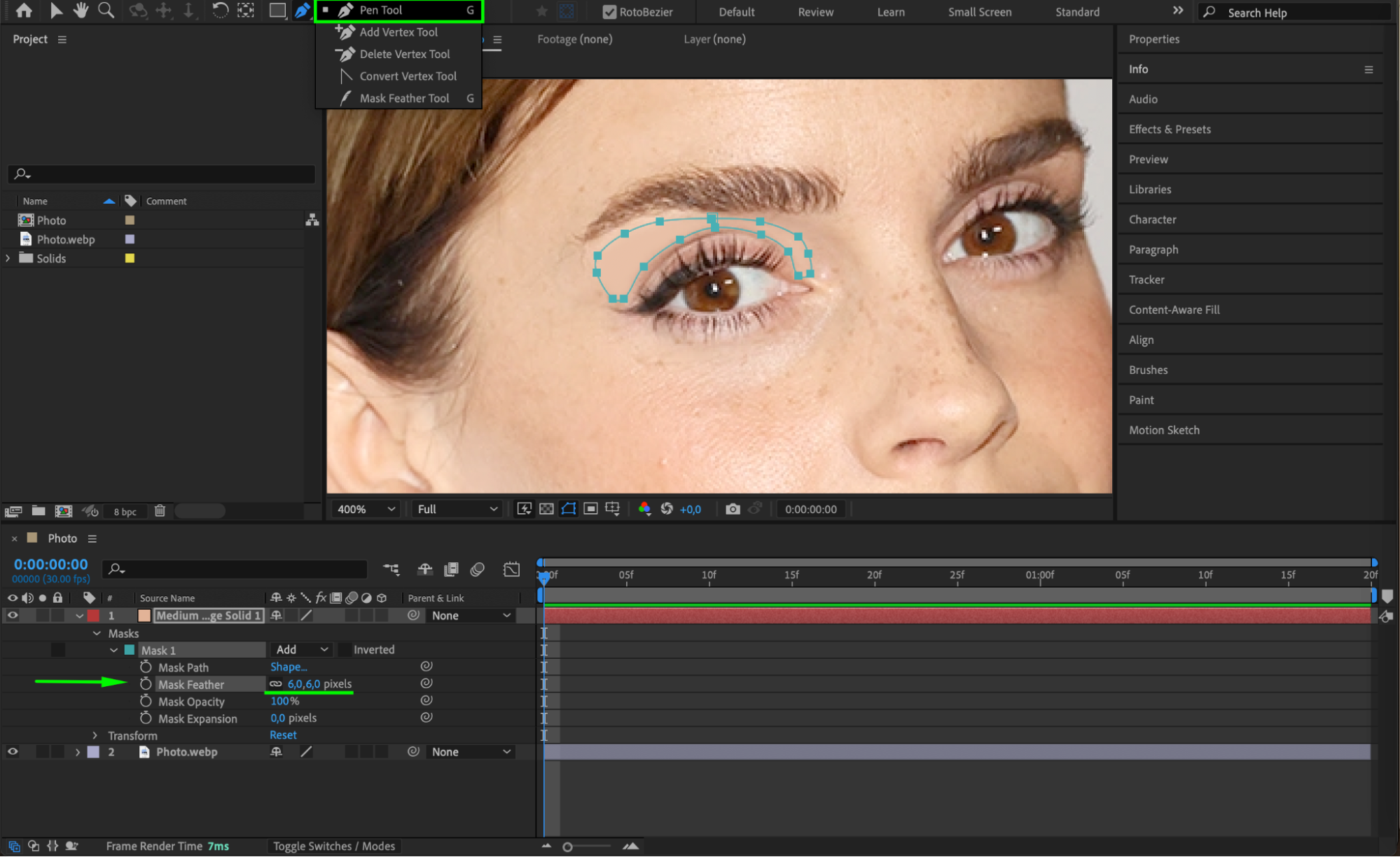 Select the Pen Tool (G) and draw a mask around the upper eyelid. Then, in the mask settings, set the Feather value to 6 to create a smooth transition.