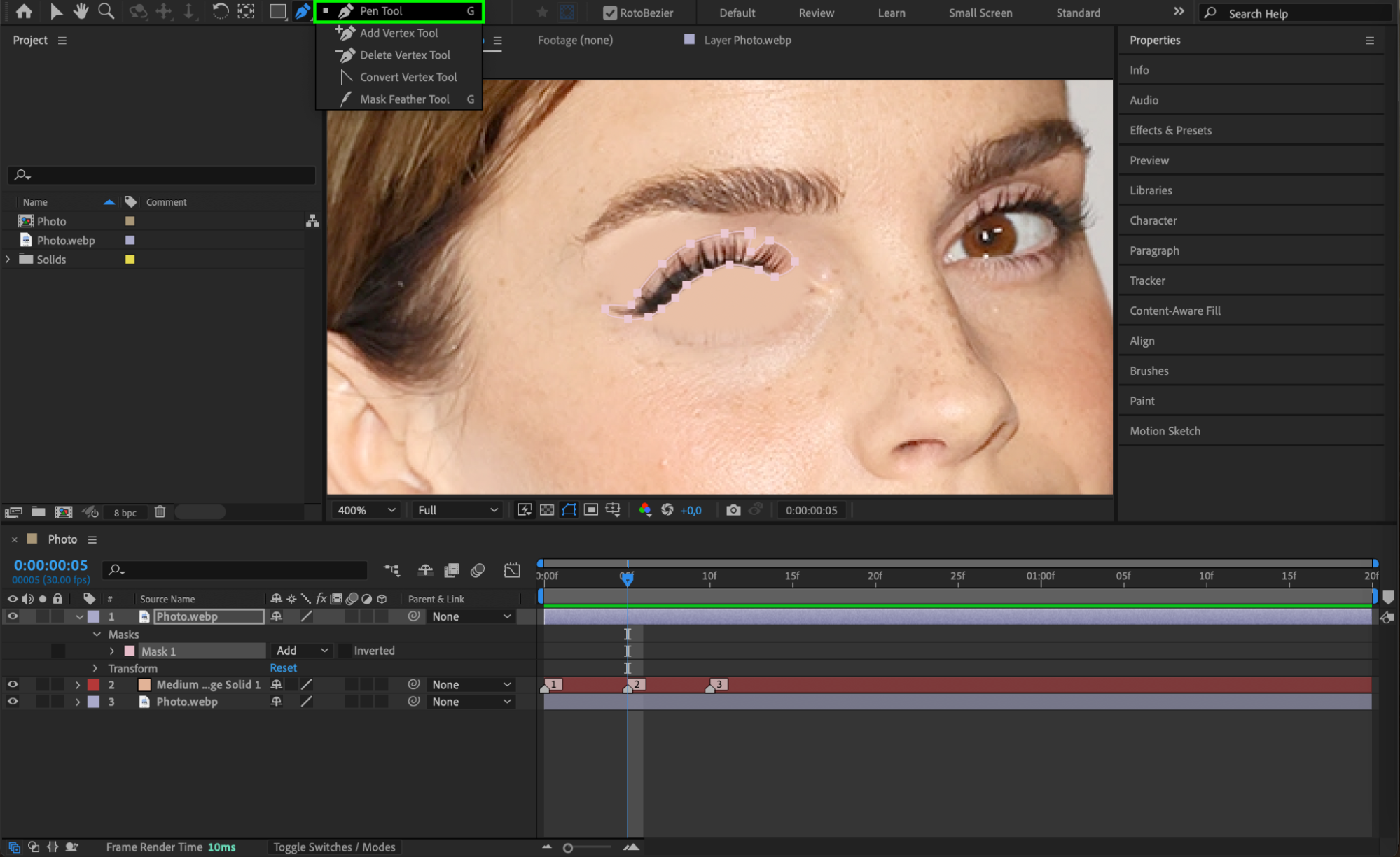 Duplicate the original photo and move it above the other layers. Use the Pen Tool (G) to create a mask around the eyelashes, ensuring they remain visible above the closing eyelid.