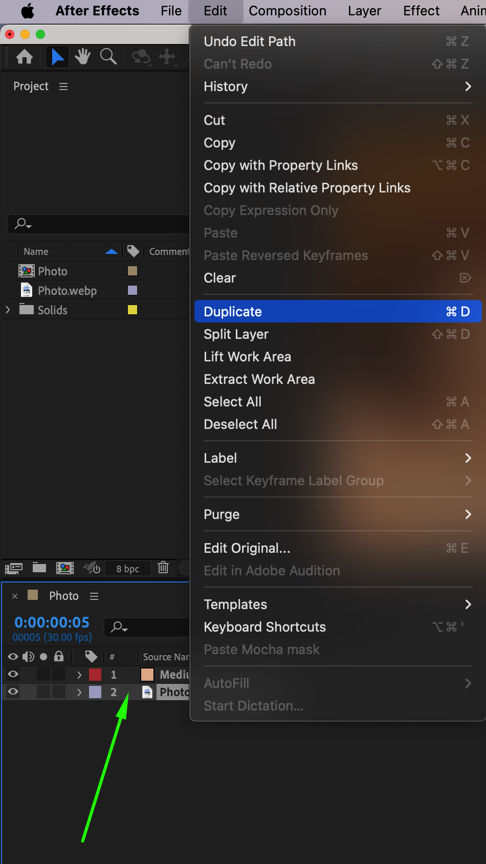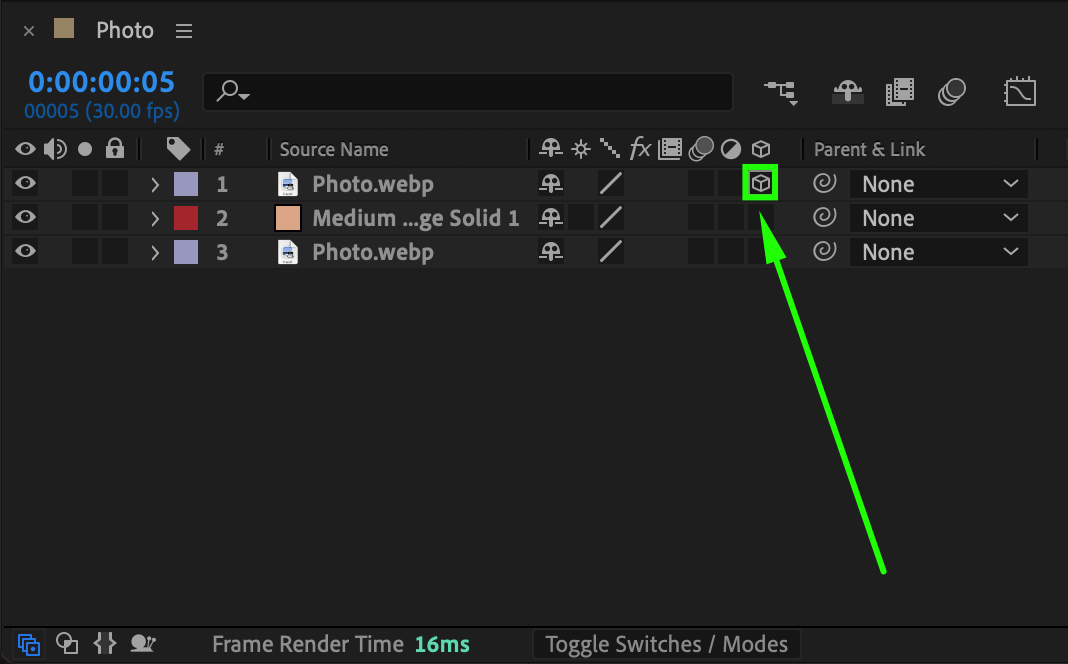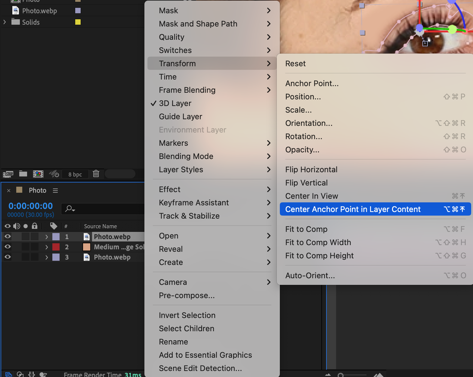 Select the duplicated photo layer and enable the 3D Layer checkbox. Then, right-click and choose Transform > Center Anchor Point in Layer Content to align the anchor point properly.