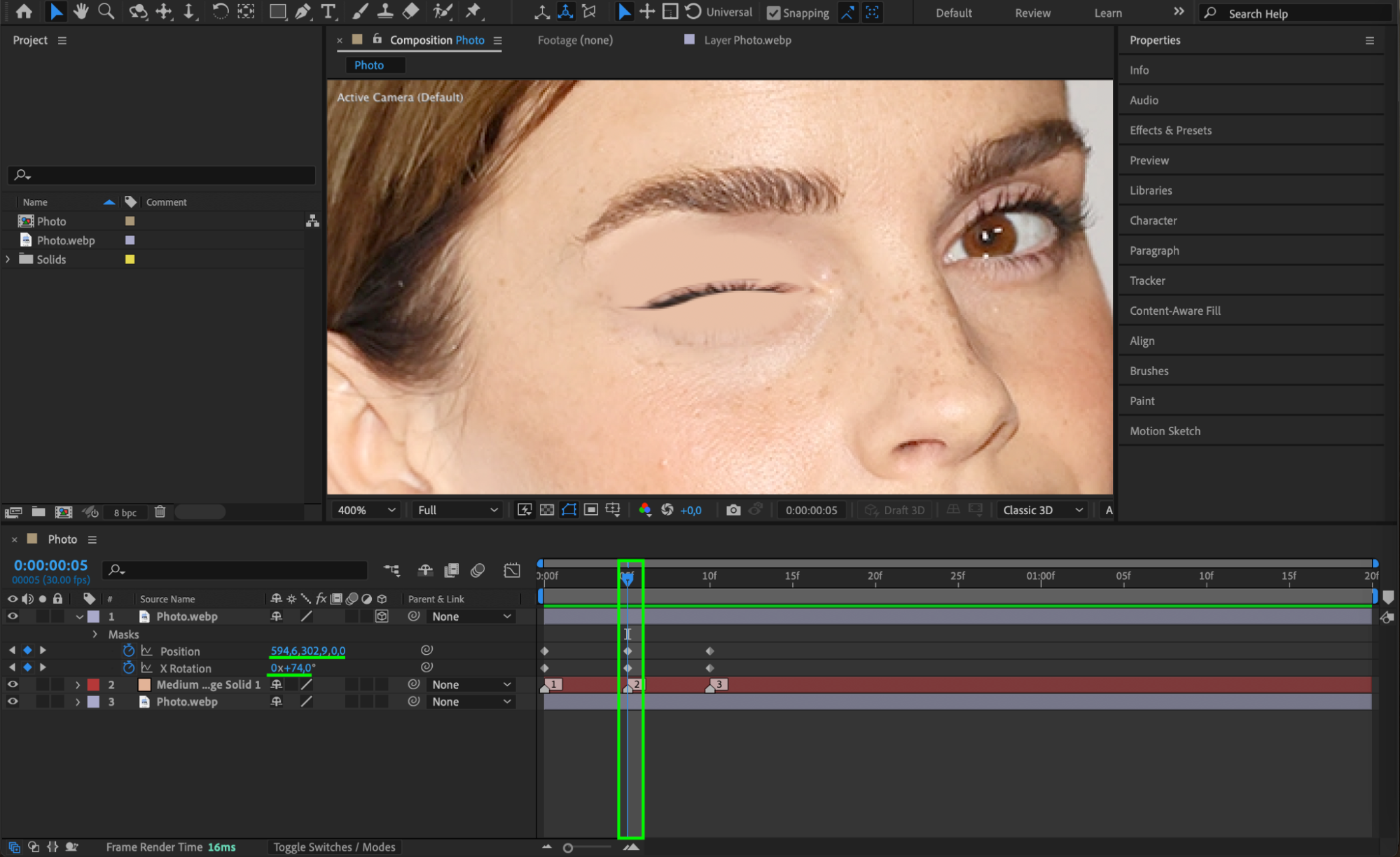 Select the eyelash layer and enable keyframes for Position and X Rotation at position 1 by clicking the stopwatch. Move to position 3 and add another keyframe without changing the values. Then, at position 2, adjust the X Rotation between 74-90 degrees and slightly shift the position to simulate the natural movement of the eyelashes as the eye closes.