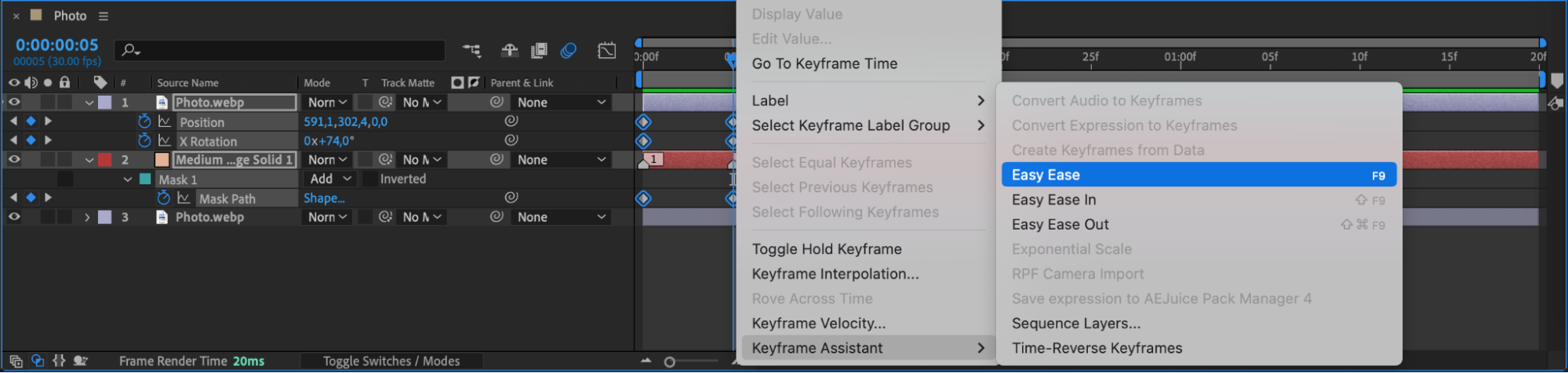 Select all keyframes, right-click, and choose Keyframe Assistant > Easy Ease to create a smoother, more natural animation flow.