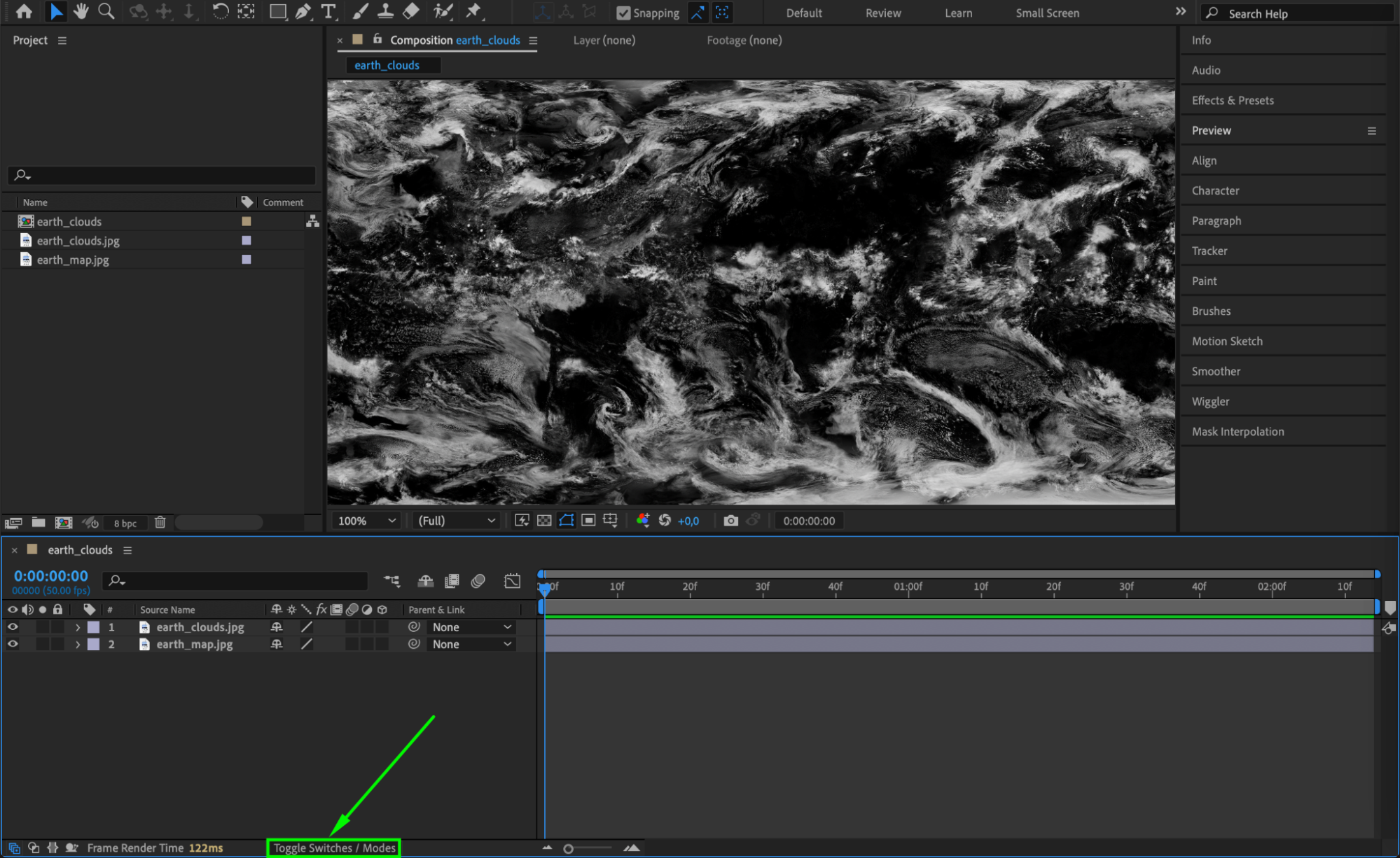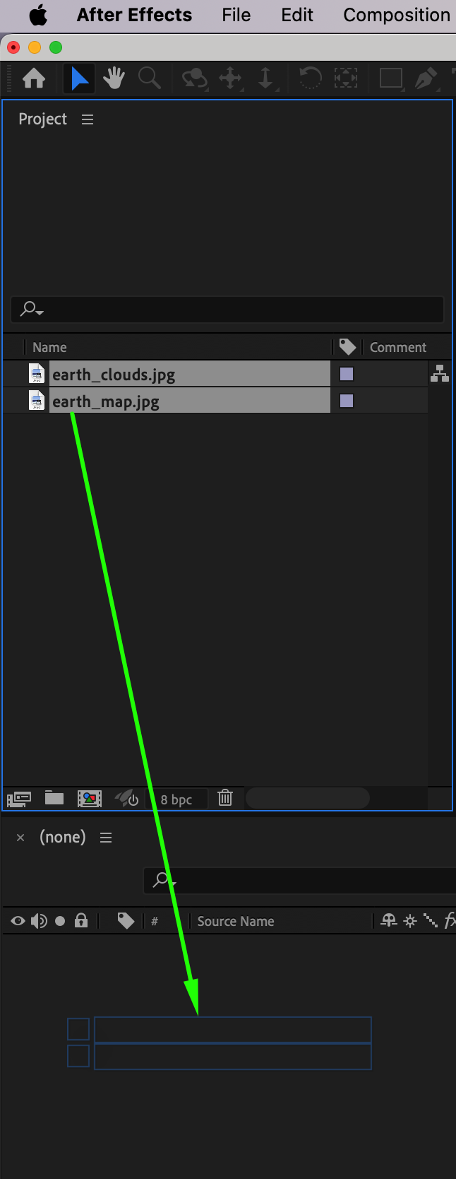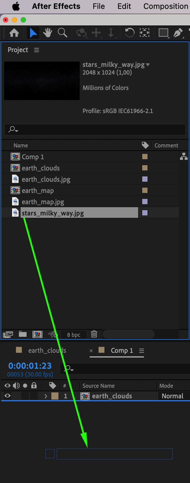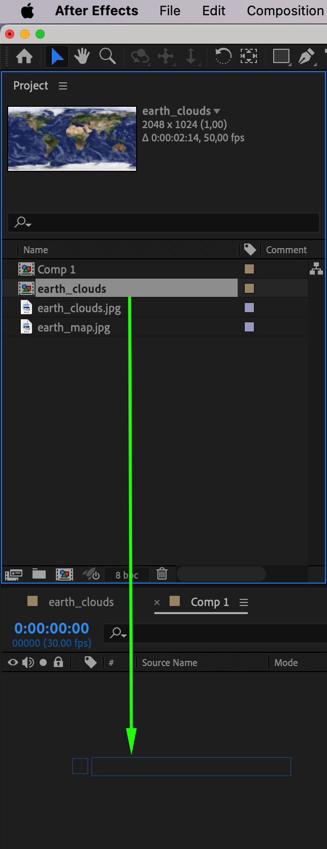 Drag the initial composition from the Project panel into the new composition’s Timeline panel. This will nest your planetary textures within the main composition as a single layer.