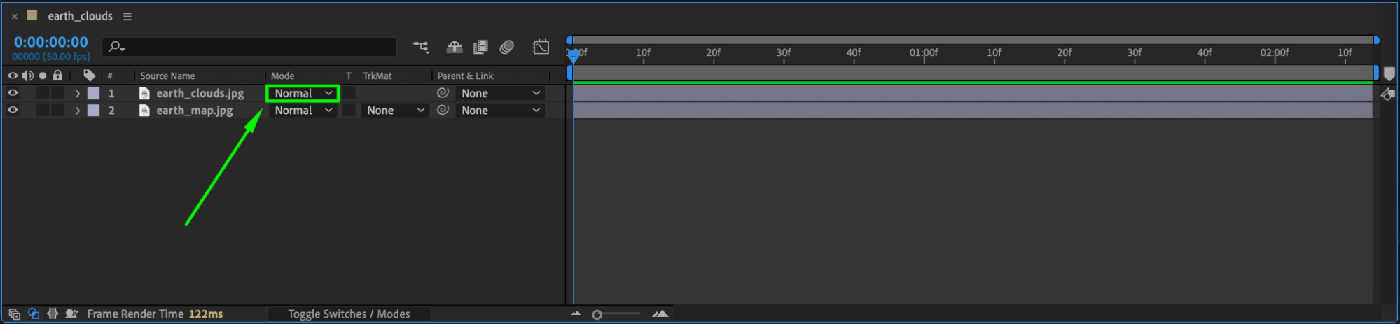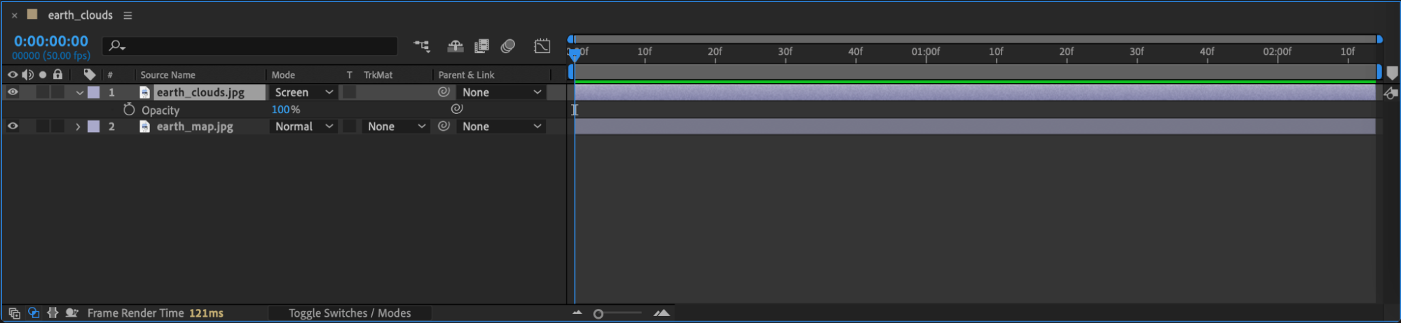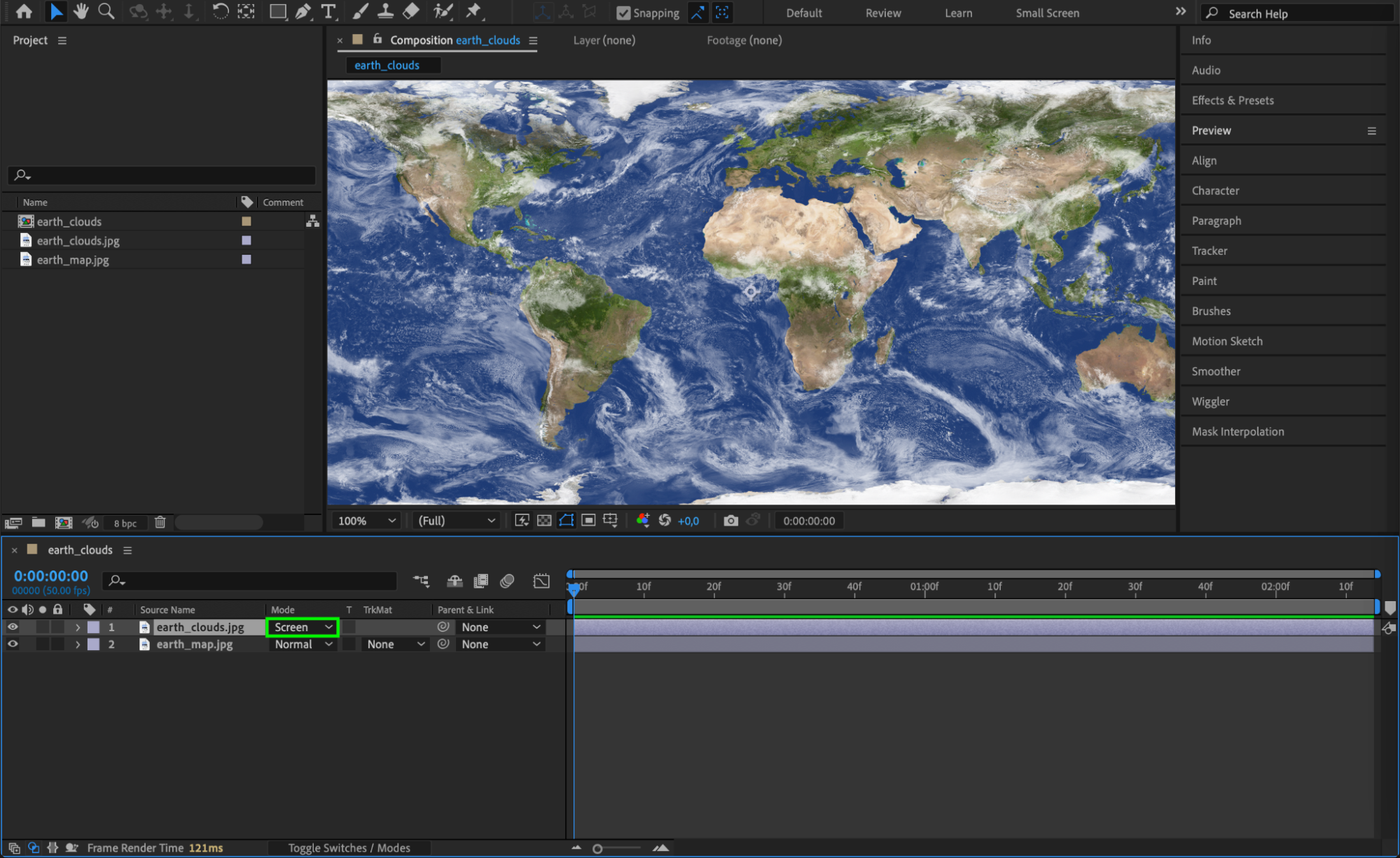 In the Timeline panel, set the blending mode of the cloud layer to Screen. This mode will make the black areas of the cloud texture transparent, allowing the underlying planet surface to show through.