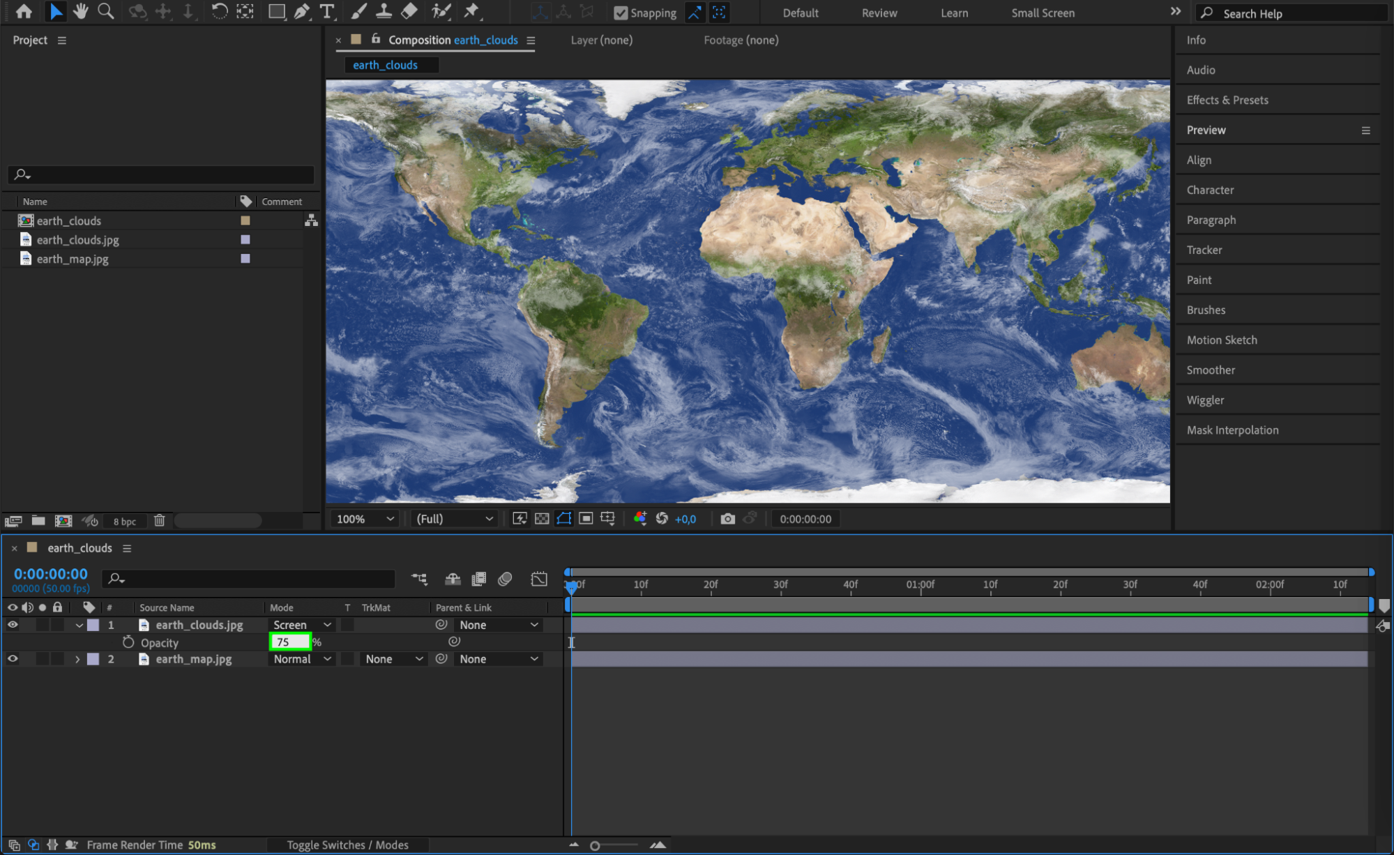 Select the cloud layer and press “T” to reveal the Opacity property. Set the opacity to 75% to achieve a more realistic and subtle atmospheric effect.