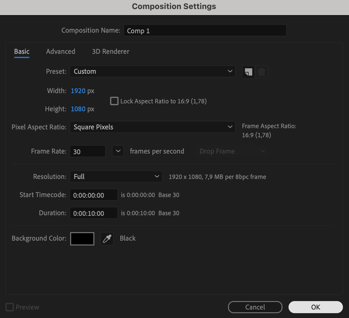 Click the “Create a New Composition” button in the Project panel. In the Composition Settings window, set the width to 1920, height to 1080, frame rate to 30, duration to 10 seconds, and background color to black. This new composition will be your main working space.