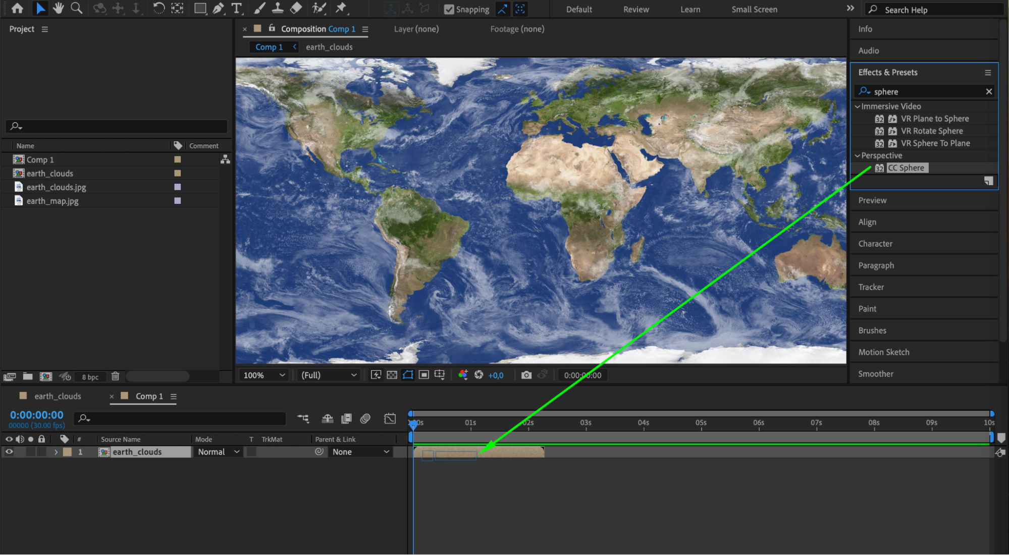 With the nested composition layer selected, go to the Effects & Presets panel and search for the CC Sphere effect. Drag and drop this effect onto the layer. In the Effect Controls panel, adjust the Radius parameter to set the desired size of your planet.