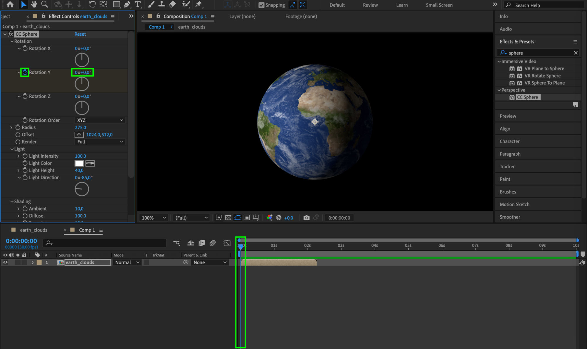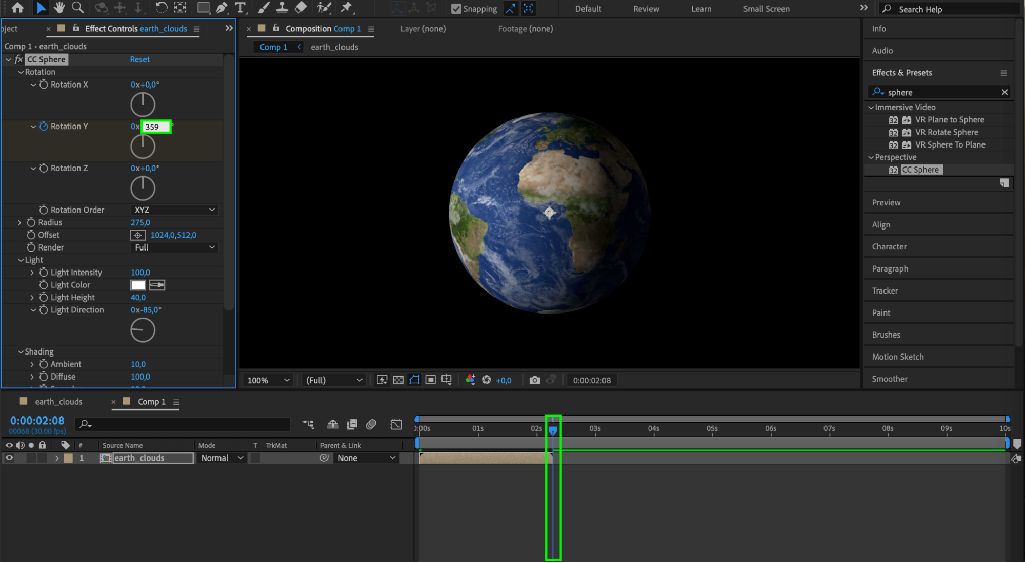 To animate the rotation, move the timeline indicator to the beginning of the composition and click the stopwatch icon next to the Y Rotation parameter of the CC Sphere effect, setting the value to 0. Then, move the timeline indicator to the end of the composition and set the Y Rotation value to 359. This will create a smooth rotation animation for your planet.