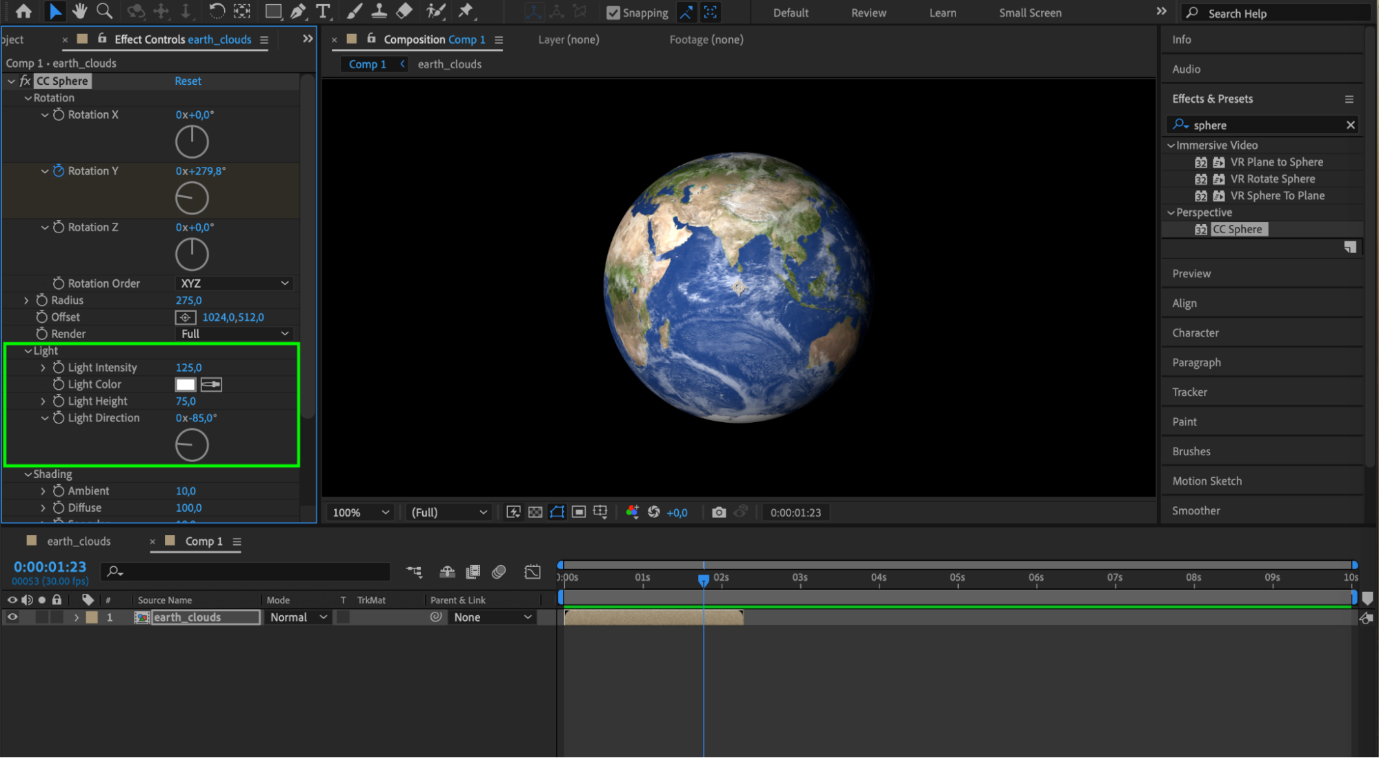 In the CC Sphere effect, adjust the lighting settings to enhance realism. Set Light Intensity to 125, Light Height to 75, and Light Direction to -85. These settings will simulate realistic lighting conditions on your planet’s surface.
