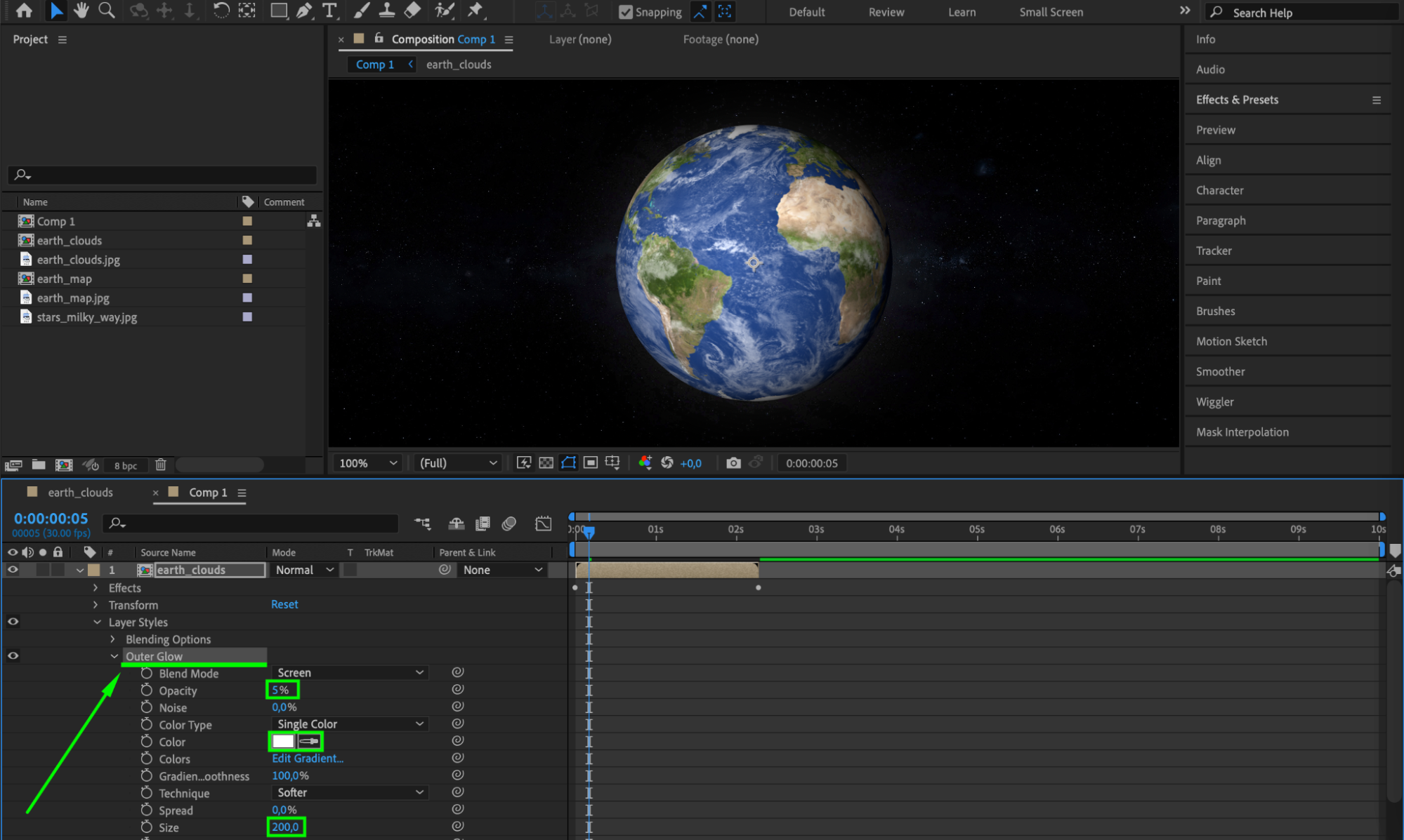 Right-click on the planet layer in the Timeline panel and select Layer Styles > Outer Glow. Expand the layer properties and adjust the Outer Glow settings: set the color to white, size to 200, and opacity to 5. This will create a subtle glow around your planet, enhancing its visual appeal.