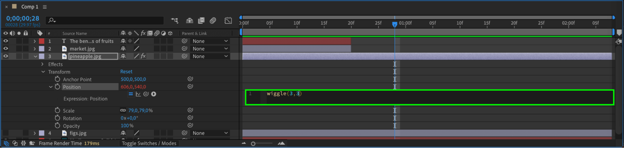Toggle layer visibility by clicking the eye icon to edit layers. Use expressions to animate images and add visual interest.