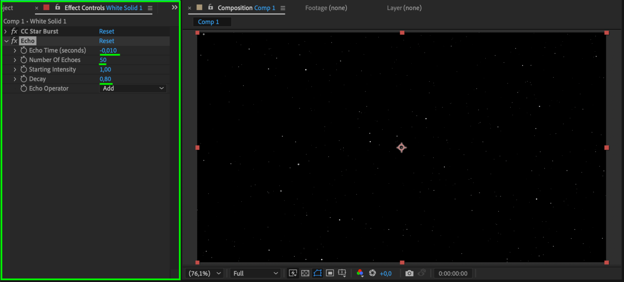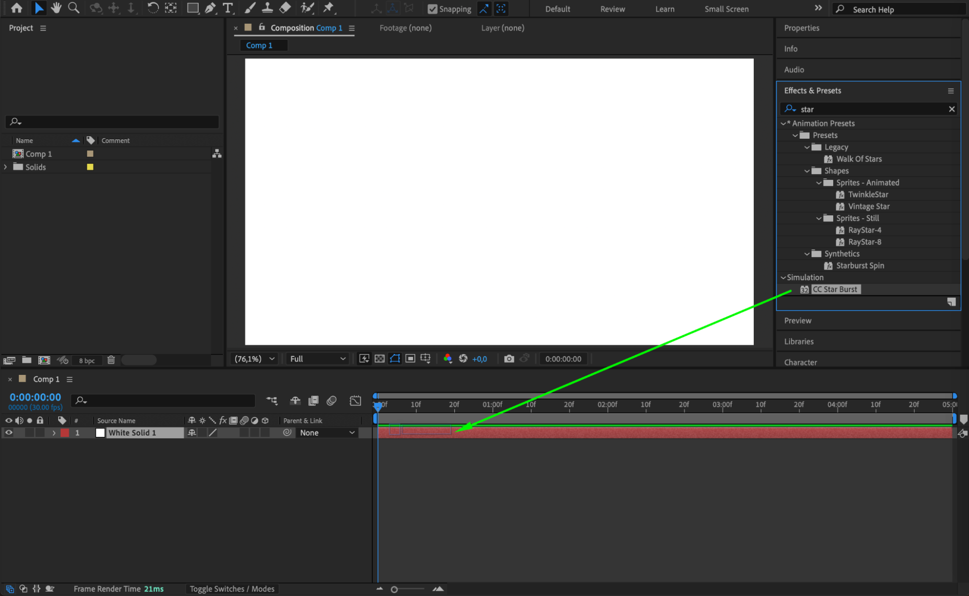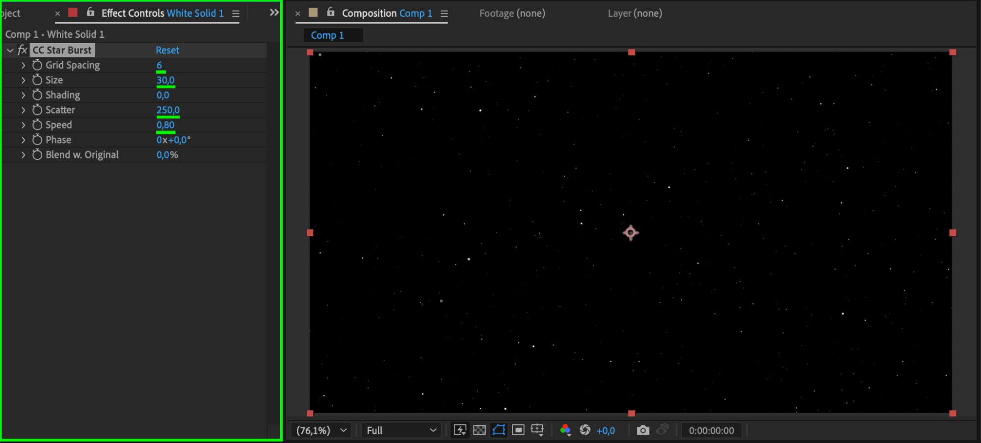 Select the white solid layer, go to the Effects & Presets panel, and search for CC Star Burst. Drag it onto the layer. In the Effect Controls Panel, set: