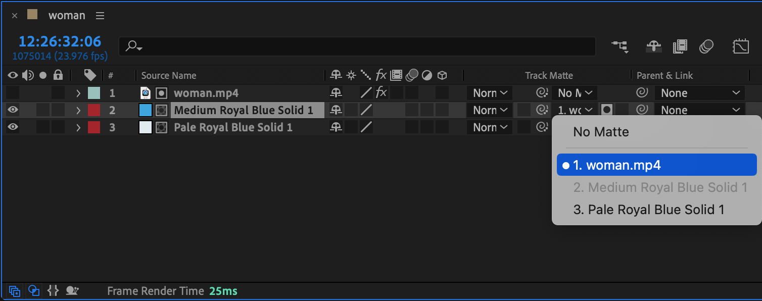 In the Track Matte column for the new solid, select the video layer. This will mask the solid layer to form the silhouette effect, filling the contours of your subject with the chosen color.