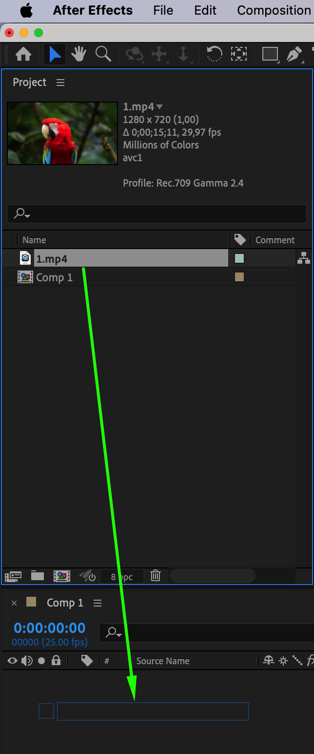 3. Add your footage to the composition: Drag and drop your footage into the newly created composition. Alternatively, you can select your footage in the Project panel and use the shortcut “Ctrl/Cmd + /+” to add it to the composition. Your footage will appear as a layer in the composition timeline.