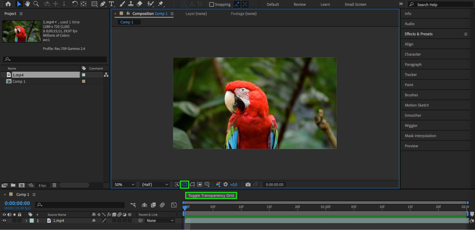 4. Enable the transparent grid: To better visualize the transparency in your composition, click the “Toggle Transparency Grid” button at the bottom of the Composition panel. The transparent grid will allow you to see the transparency in your composition without any background distractions