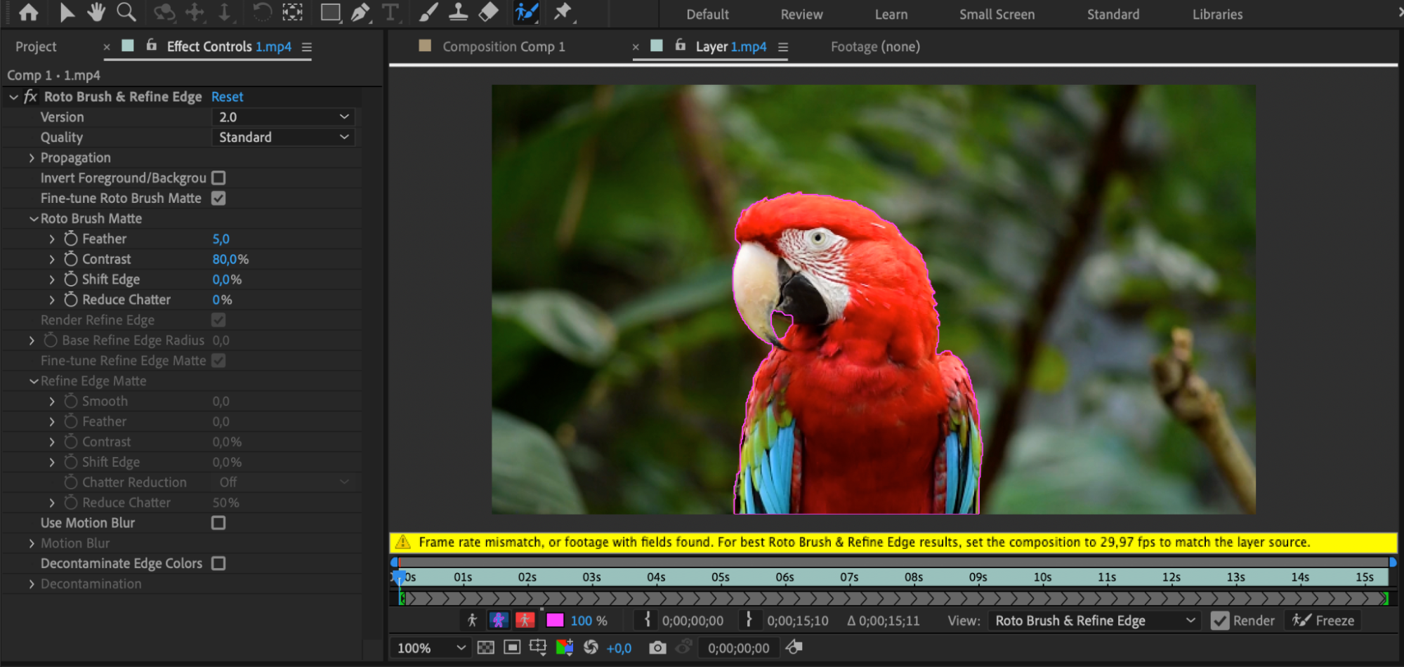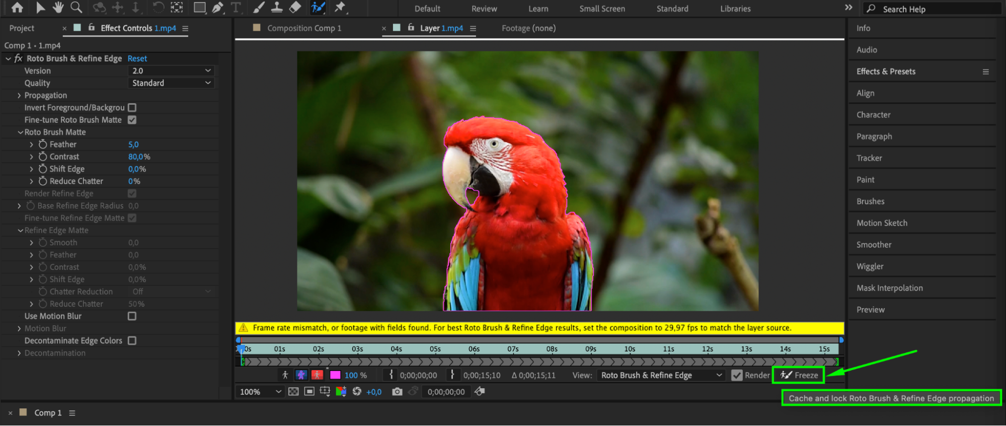 5. Background removal: Utilize tools such as the Roto Brush (“Alt/Option + W”) or Pen Tool (G) to remove the background. To do this, select the object in a way that leaves the background outside the selection area, then click the “Freeze” button to analyze the selection frame by frame.