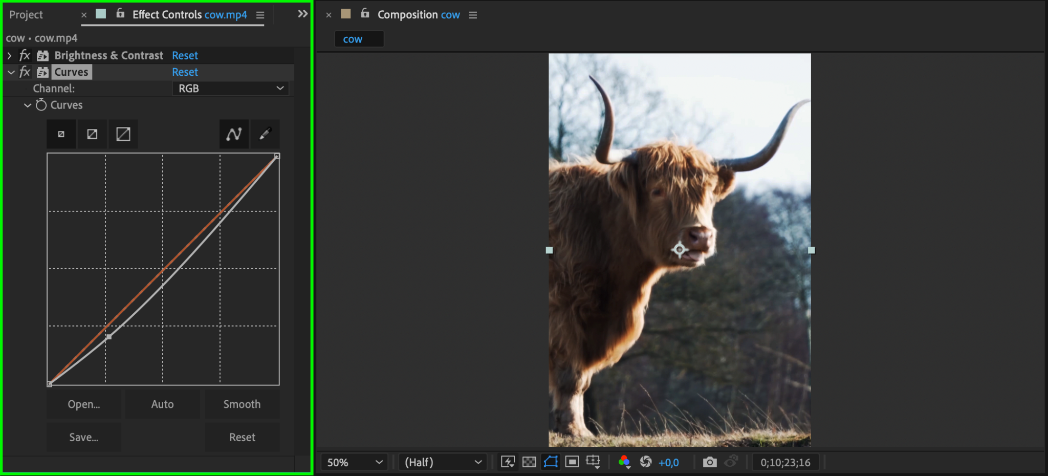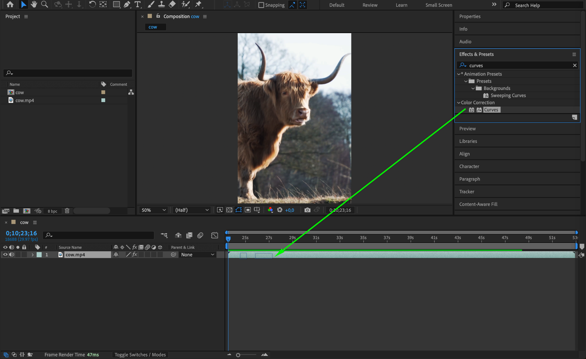 For more control over shadows and highlights, use the Curves effect. Select your video layer, then go to Effect > Color Correction > Curves. In the Curves panel, pull down the curve line towards the lower end to make darker areas more intense while maintaining midtones. This allows you to selectively darken parts of the image without losing too much detail.