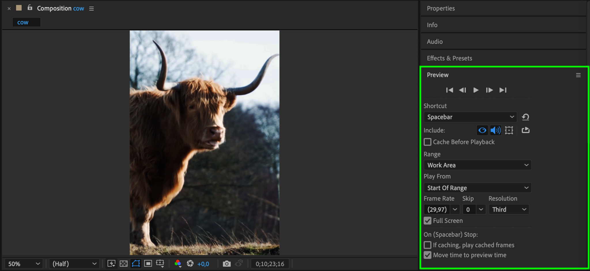 After making the changes, preview your video to ensure the adjustments look natural. Press the spacebar to play back the composition and check the overall appearance. Make any further tweaks to effects or opacity if needed.