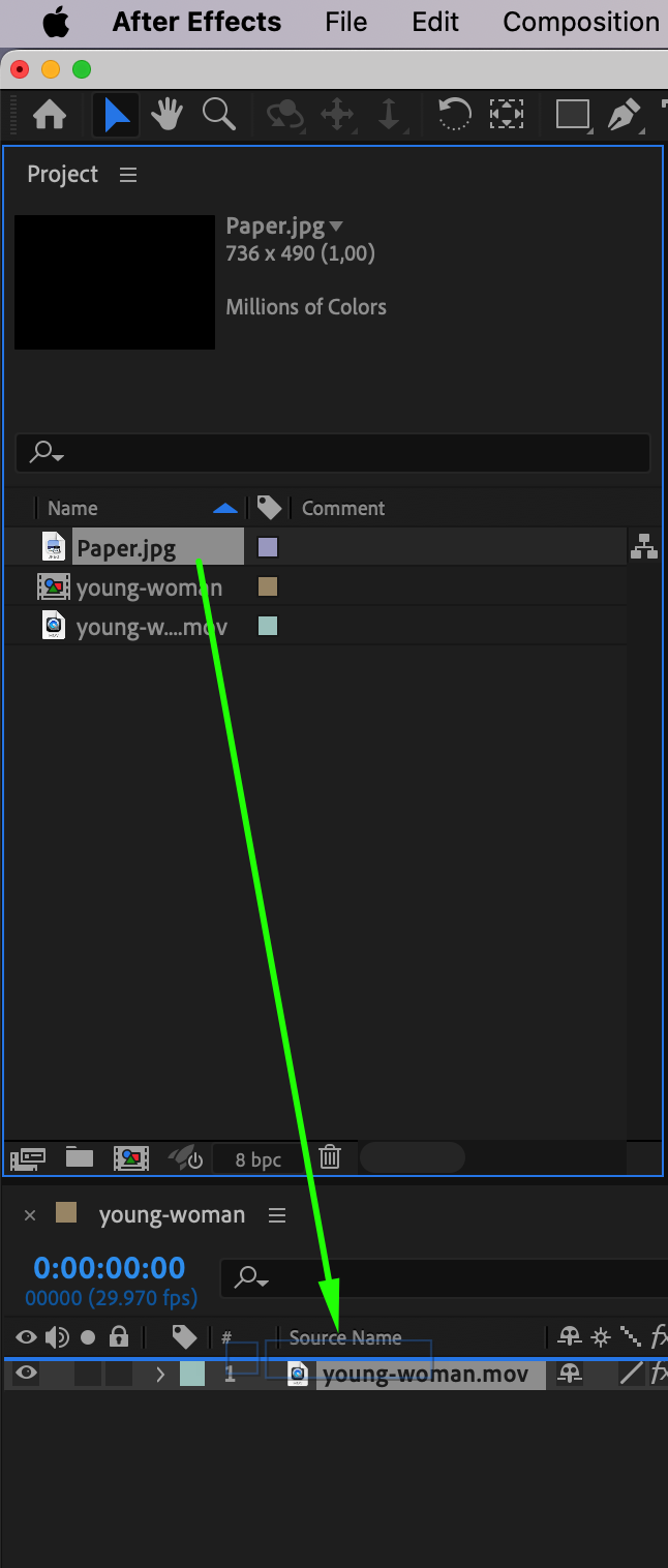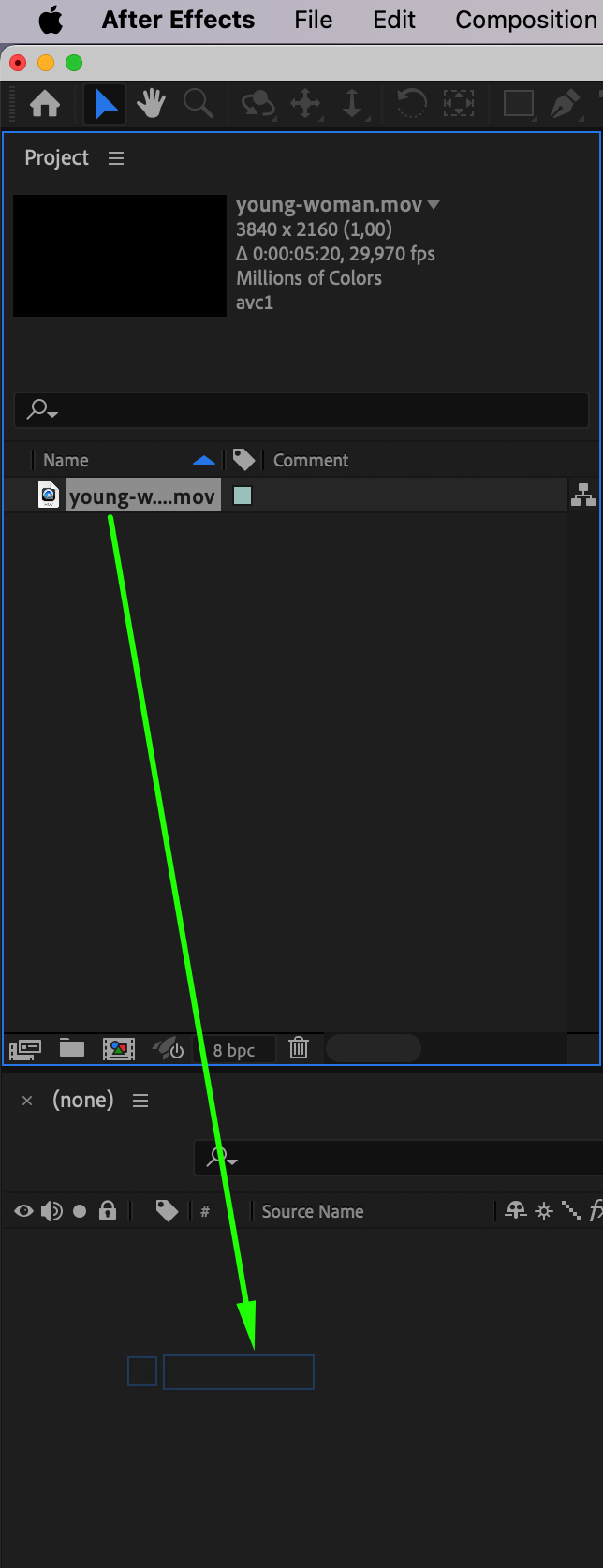 Go to File > Import > File and bring your video into the project. Then, drag the footage onto the timeline to create a new composition. This sets the comp to match the resolution and frame rate of your video.