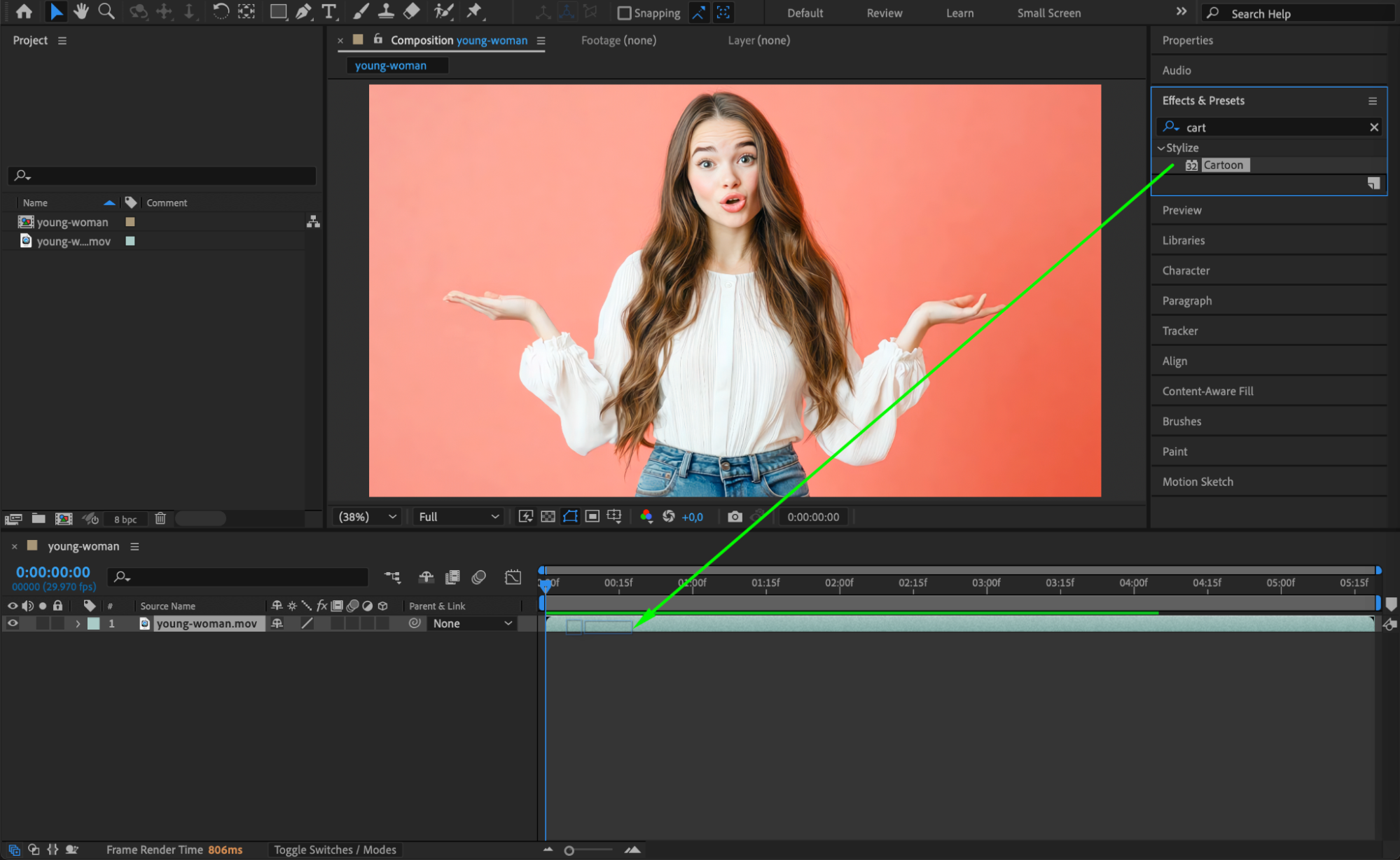 Select your video layer and open the Effects & Presets panel. Search for Cartoon and apply it to the layer. This effect will automatically stylize the video into a hand-drawn look by simplifying the colors and adding edge lines.