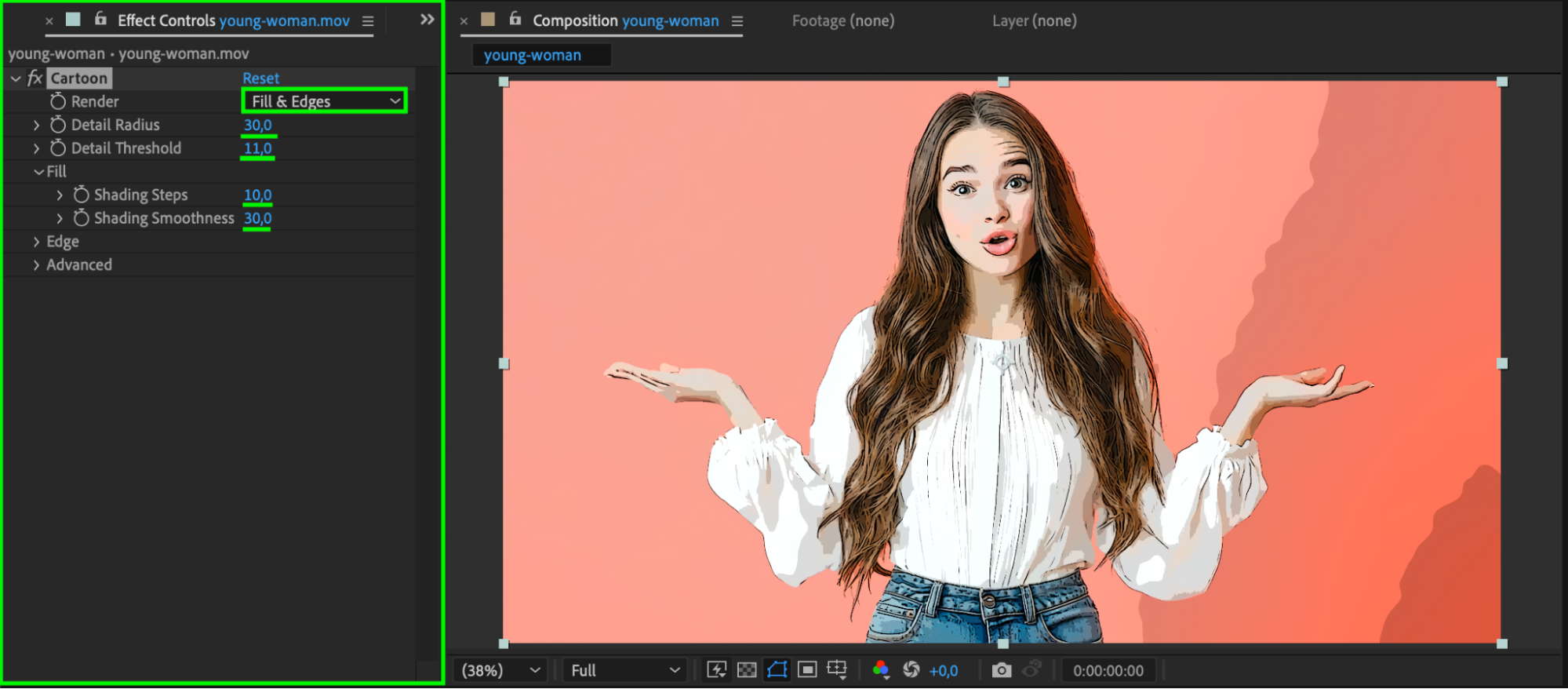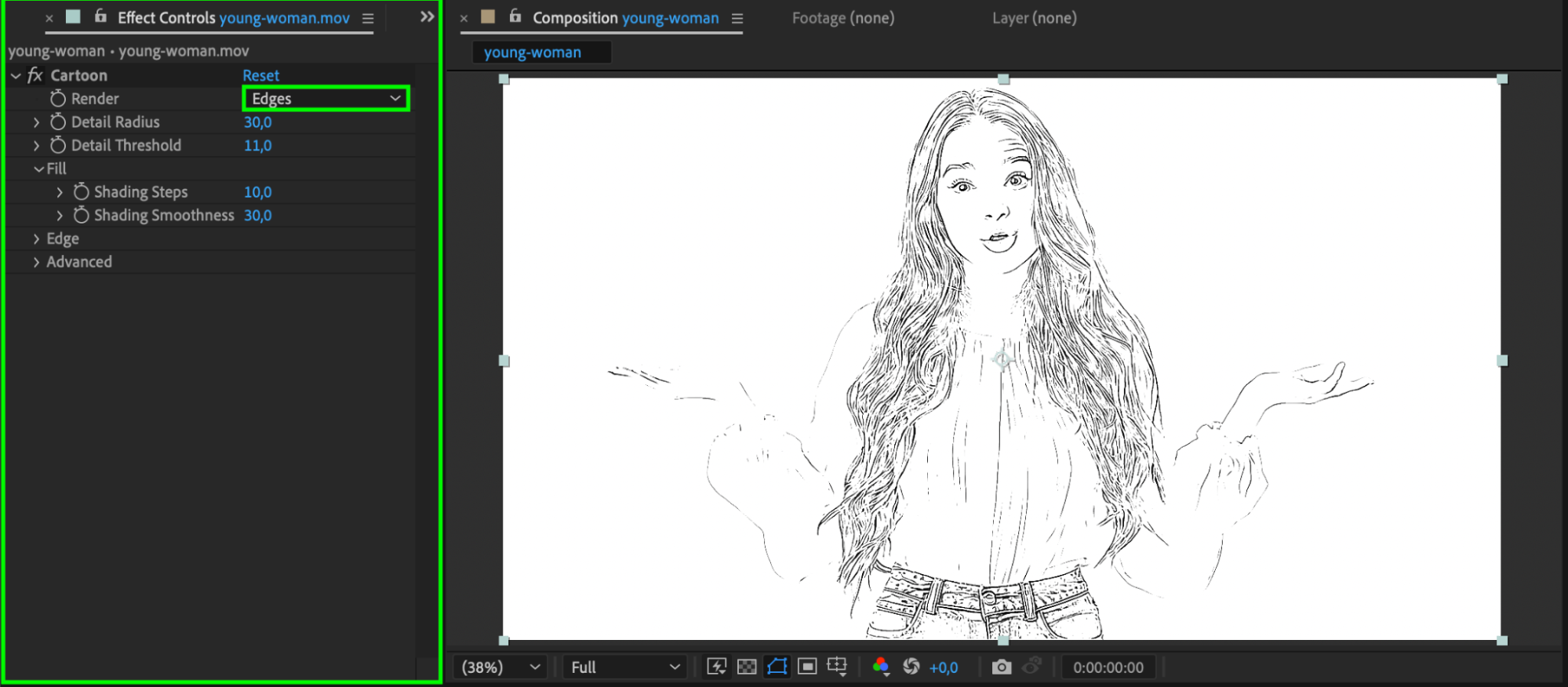 In the Effect Controls panel, change the Render option to Fill & Edges (for a colored cartoon) or Edges (for a black-and-white sketch look). Adjust the settings for a cleaner result: