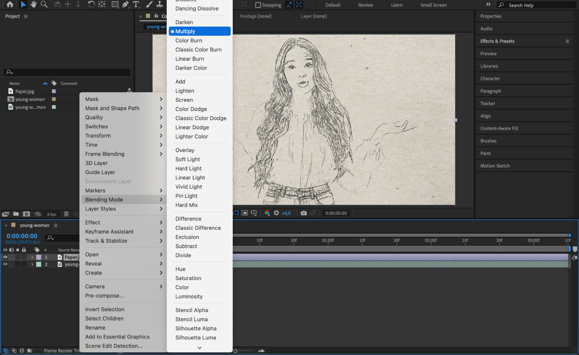 To enhance the hand-drawn feel, import a paper texture image (like watercolor or sketch paper). Place it above your video layer and set the Blending Mode to Multiply. This gives the entire animation a textured, illustrated look.