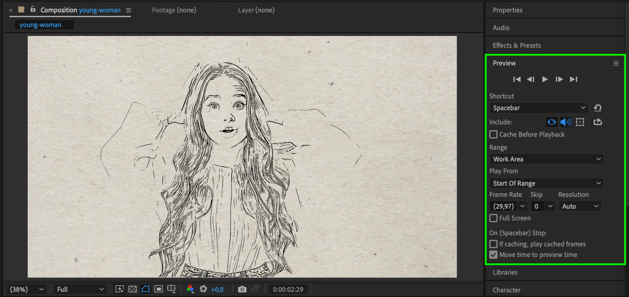 Press the Spacebar to preview your video and see how the cartoon effect looks in motion. If needed, tweak the settings or texture layer to refine the appearance.