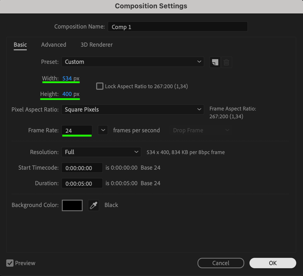 Go to Composition > New Composition and set the width to 534px, height to 400px, and frame rate to 24 fps for a classic old-film look.