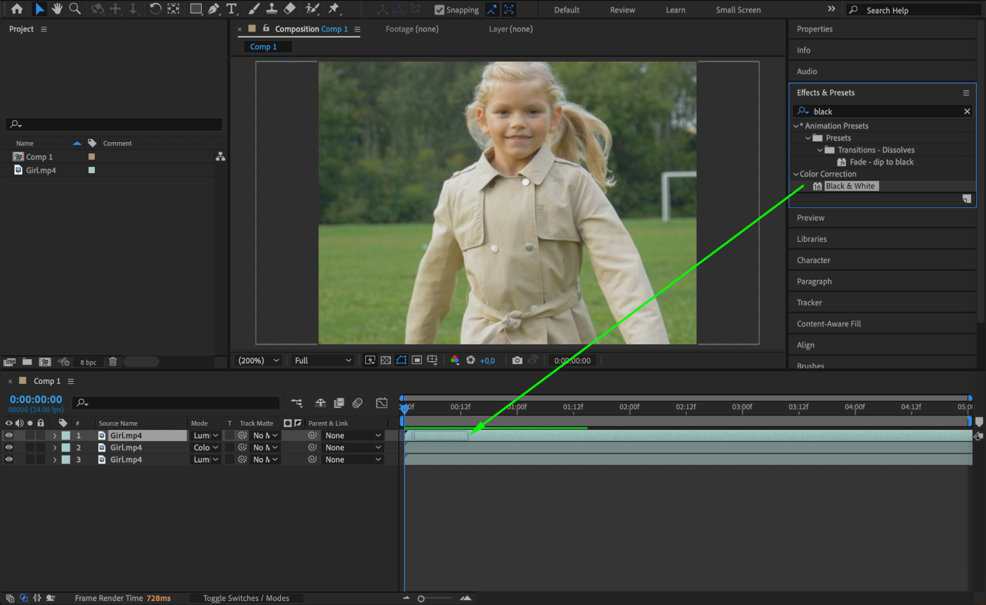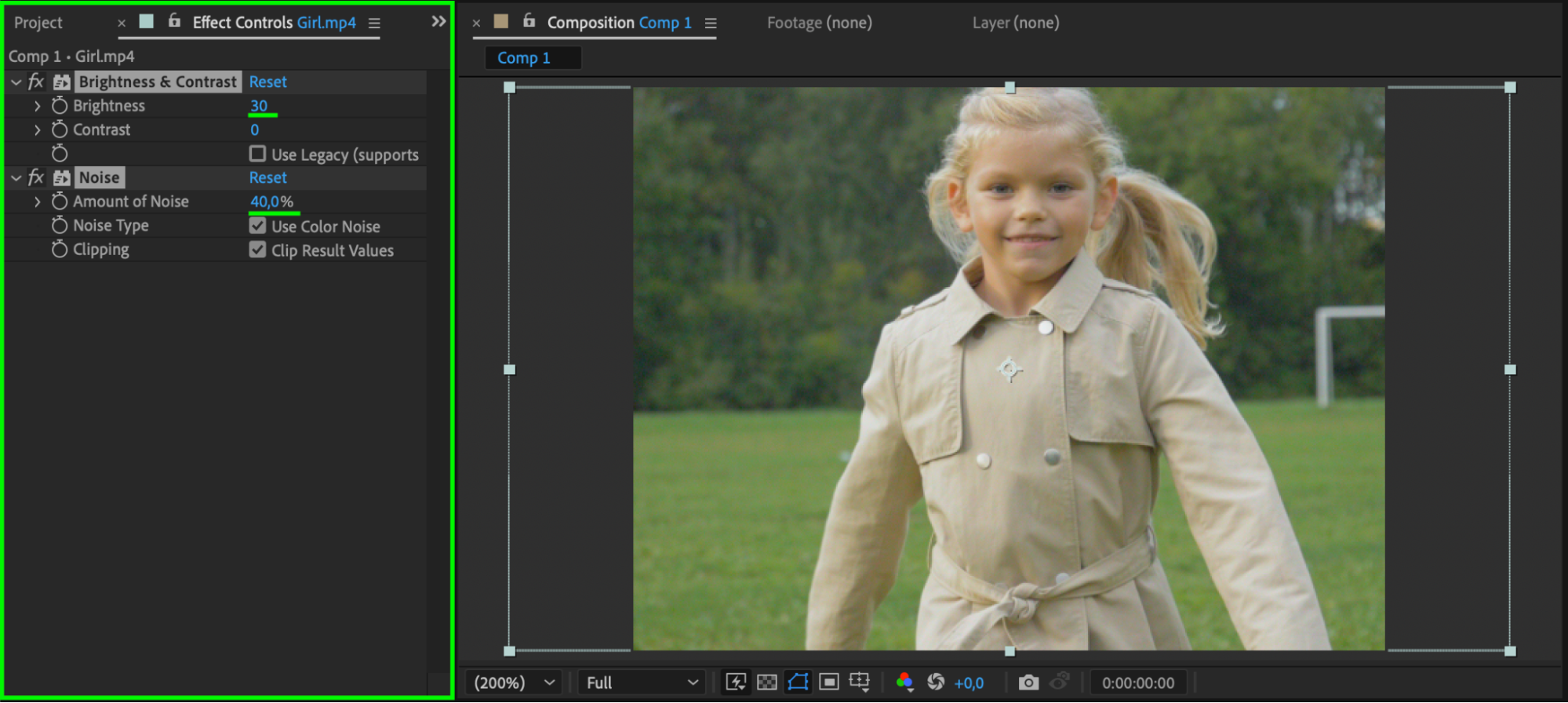 Select the middle layer and apply Brightness & Contrast and Noise from the Effects & Presets panel. Set Brightness to 10-30 and Noise Amount to 20-40 to create a grainy film texture.