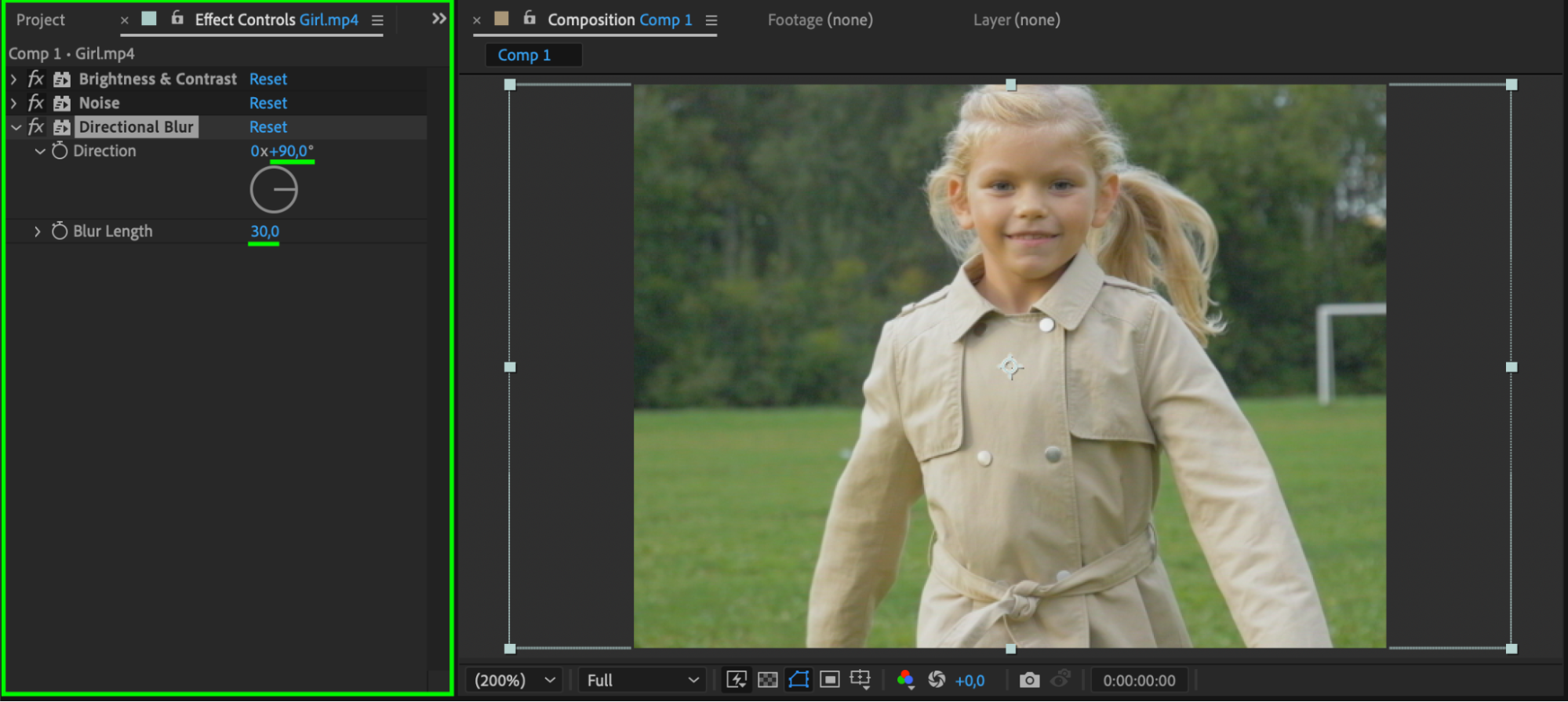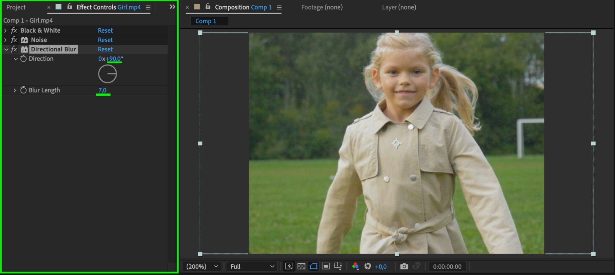 Apply Directional Blur to the middle layer. Set the Direction to 90° and Blur Length to 30 to simulate vertical smearing often seen in aged footage.