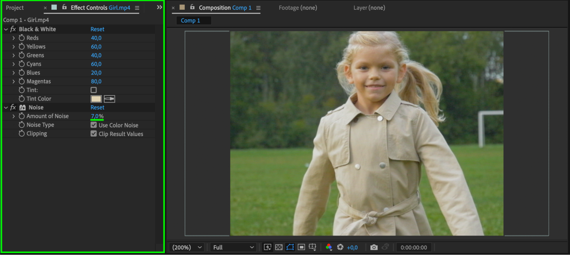 Apply Black & White and Noise to the top layer. Set Noise Amount to 7 for subtle texture variation.