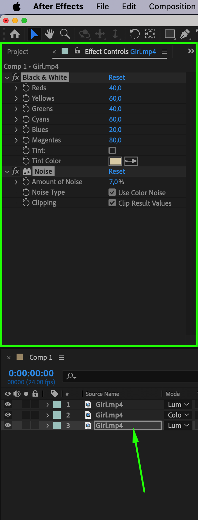 Copy the Black & White and Noise effects from the top layer and paste them onto the bottom layer to maintain consistency.