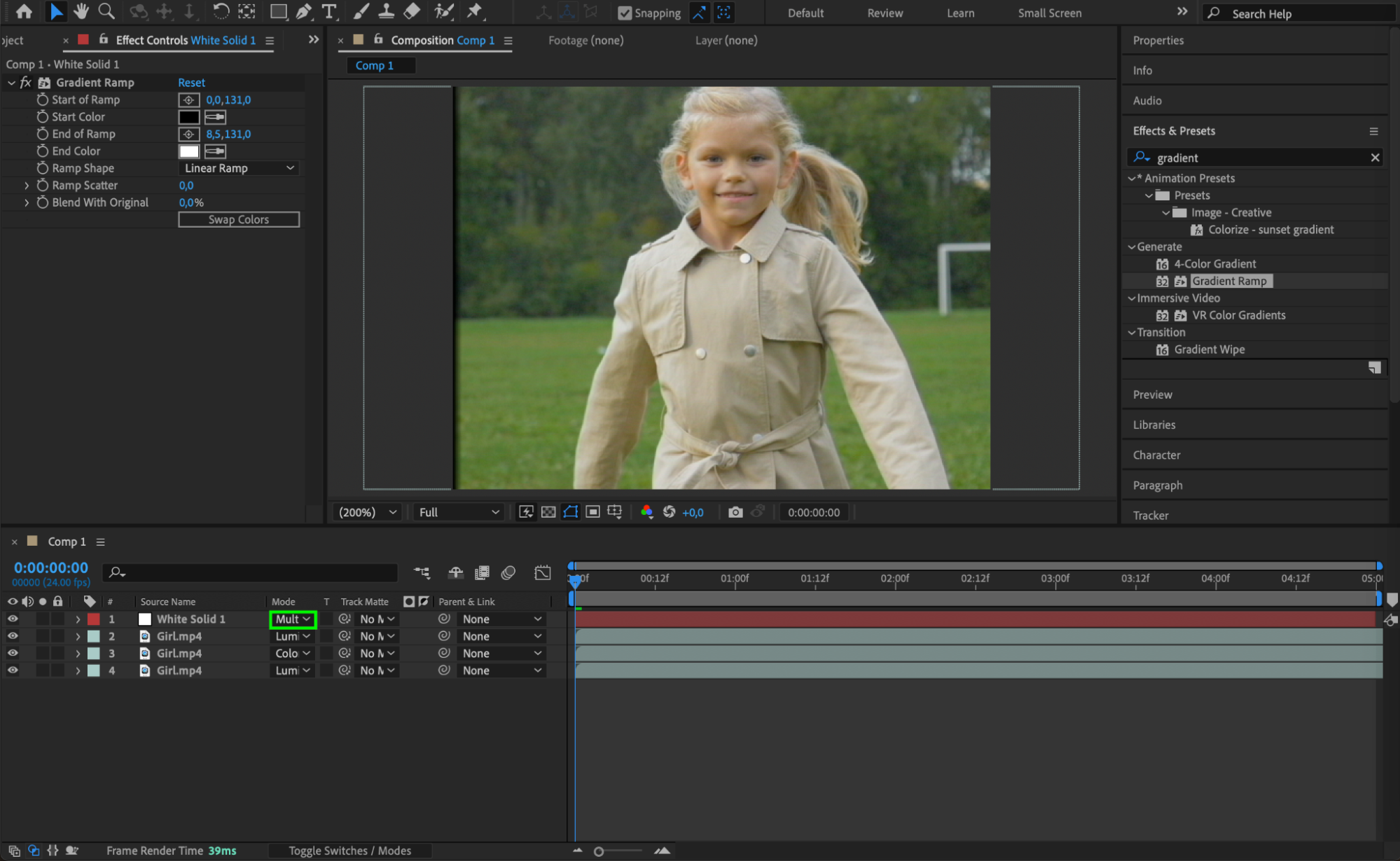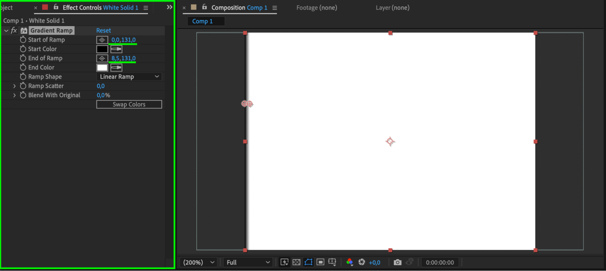 Apply Gradient Ramp to the solid layer. Set the Start of Ramp to (0,0;131,0) and the End of Ramp to (8,5;131,0). Change the Blending Mode to Multiply for a faded film appearance.