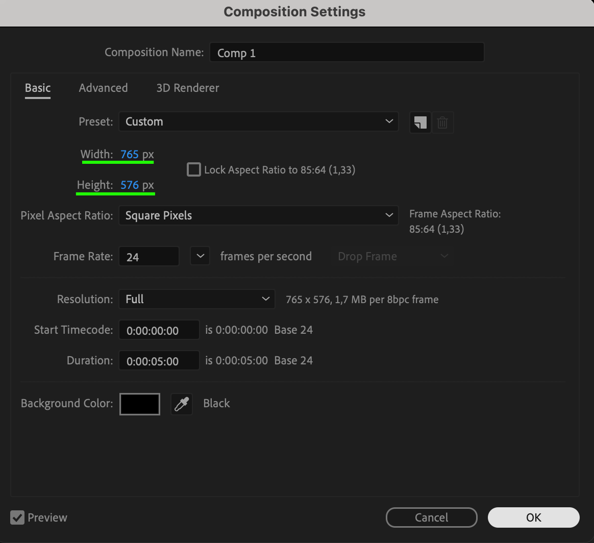 Go to Composition > Composition Settings and change the Width to 765px and Height to 576px for a standard vintage film resolution.