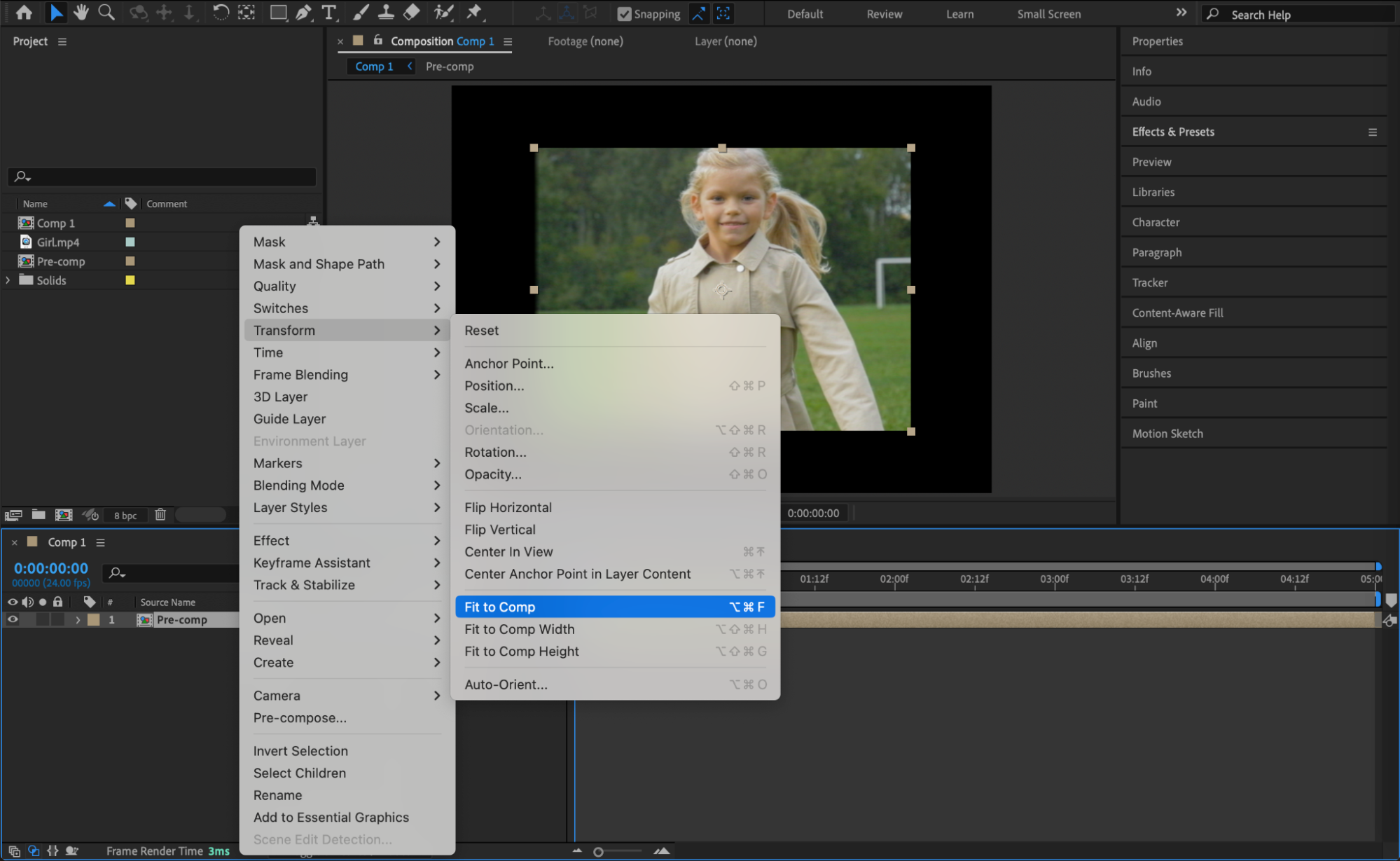 Right-click on the pre-comp layer and select Transform > Fit to Comp to resize it accordingly.