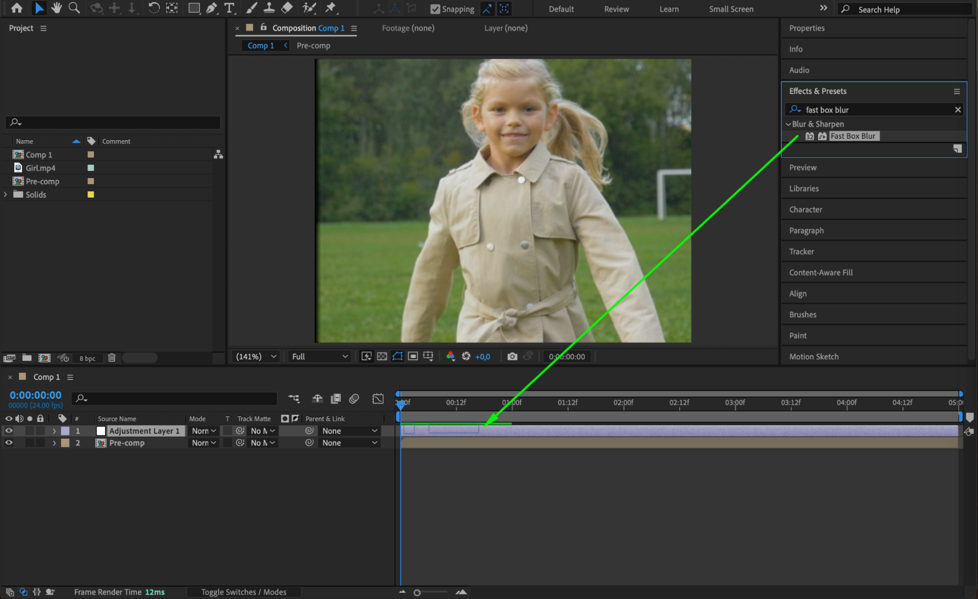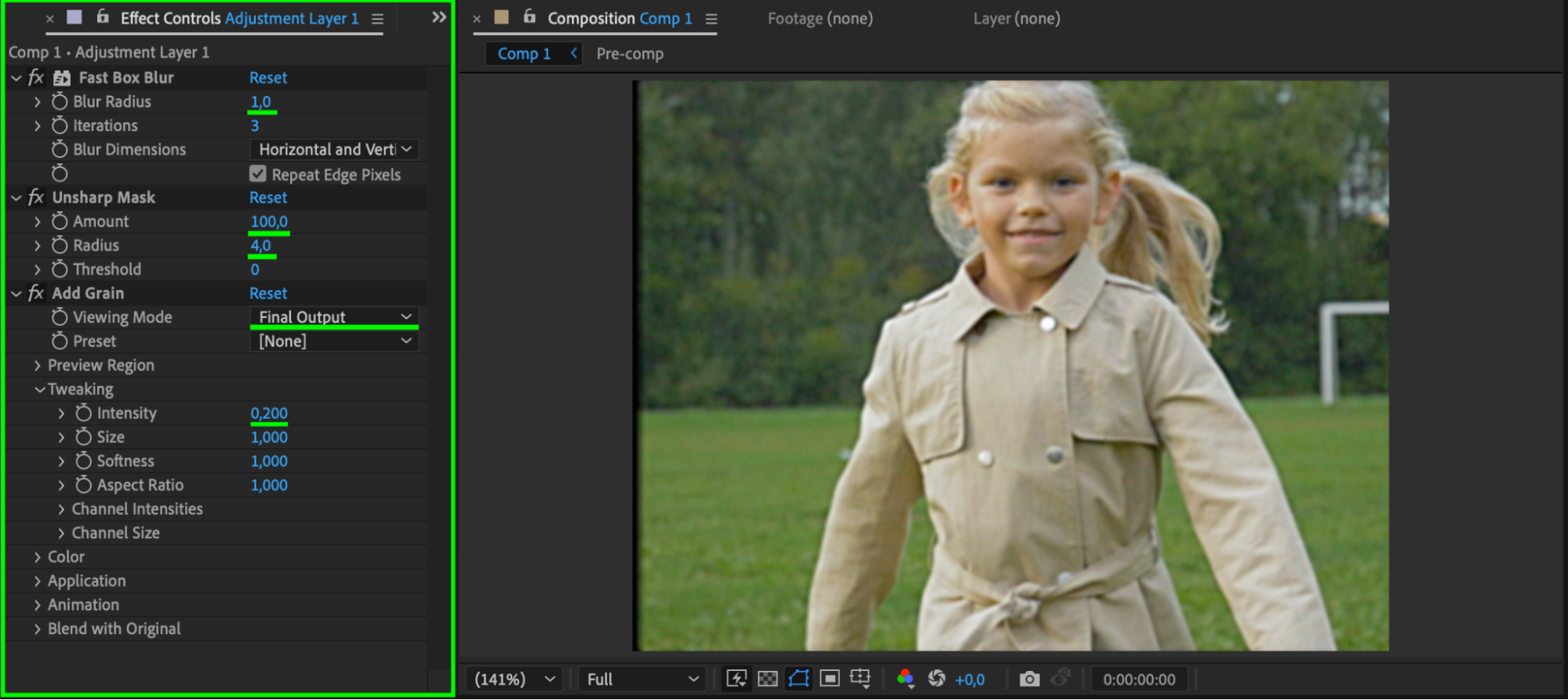 Apply Fast Box Blur, Unsharp Mask, and Add Grain to the adjustment layer. Set Blur Radius to 1, Unsharp Mask Amount to 100, Radius to 4, Grain Intensity to 0.2, and choose Final Output as the viewing mode.