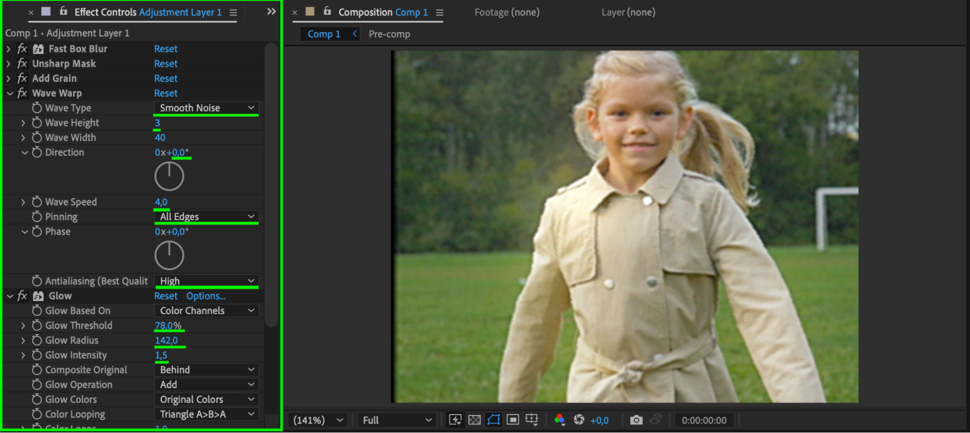 Apply Wave Warp and Glow to the adjustment layer.